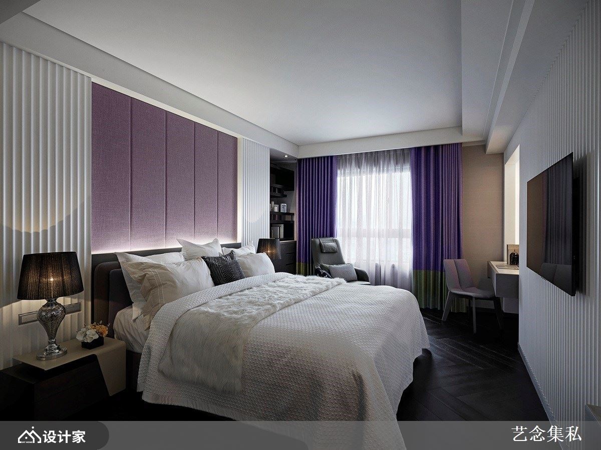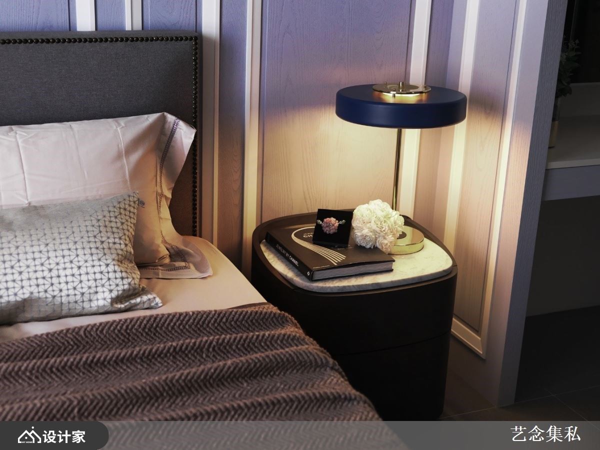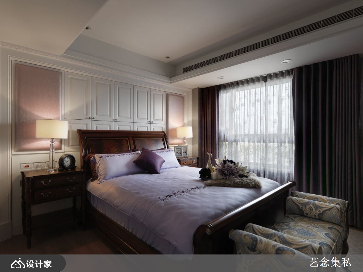 寝居空间是最能彰显个人喜好的场域,在这个15-30㎡ 的空间中,可以随心所欲的装饰与布置,展现专属于你的独特魅力。艺念集私空间设计张绍华与黄千祝总监擅长以客制化设计打造融合时尚与古典美的订制风格,在寝居空间中更创新地运用视觉感强烈的紫色调作为主题。从最简单的设计着手,挑选木纹带紫色花纹的墙纸作为空间主题,更进阶地透过编织材质与布料展现色调柔美的一面。美式风格中经典的线板与深色原木结合深浅紫色的床包与抱枕,让时空移转到古典庄园中,满足每个女人心目中向往的浪漫氛围。