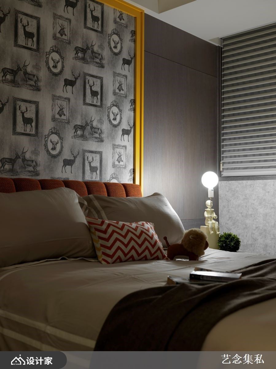 提到木质调第一个画面就让人联想到以浅色木头打造的无印风格,但其实围绕着色彩规划,不是只有原木才能形塑木质调空间。艺念集私空间设计张绍华与黄千祝总监擅长运用异材质拼接创造新颖又和谐的设计,木质调运用在卧室最经典的木质元素除了木地板与木作柜之外,打造一座木制床架能营造带点复古美式的风格。挑选咖啡色系绷布材质作为床头板,搭配背墙木纹壁纸与镀钛金属元素,能让温暖的木质空间呈现更精致奢华的氛围。另外,节理明显的深色木头混搭水泥漆和黑铁工艺,能呈现柔中带刚的个性设计,配合间接照明或气氛灯,打造有个性又舒适的木系寝居空间。
