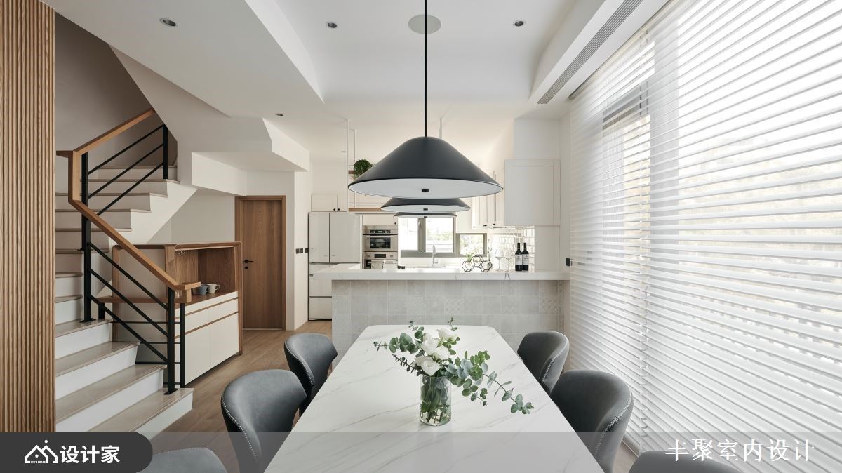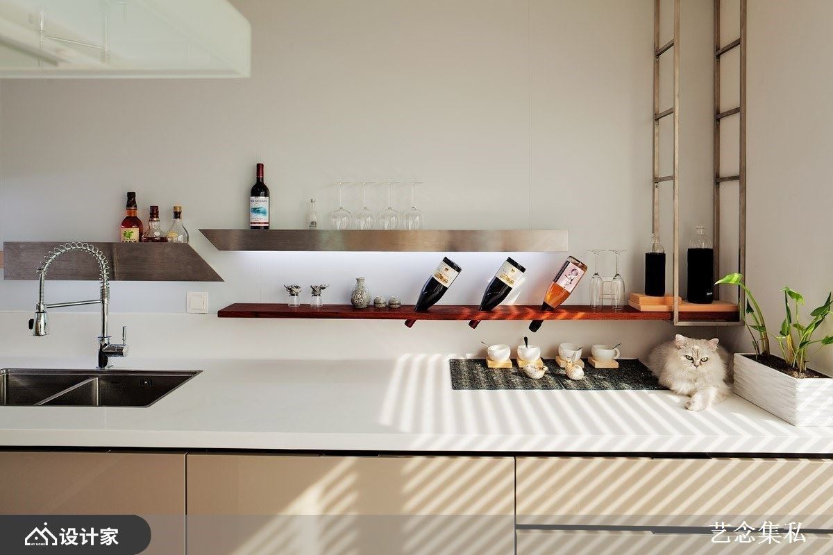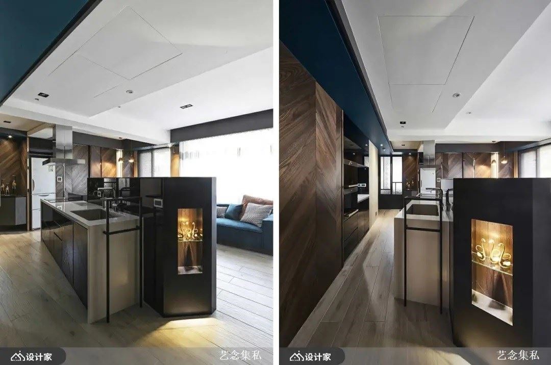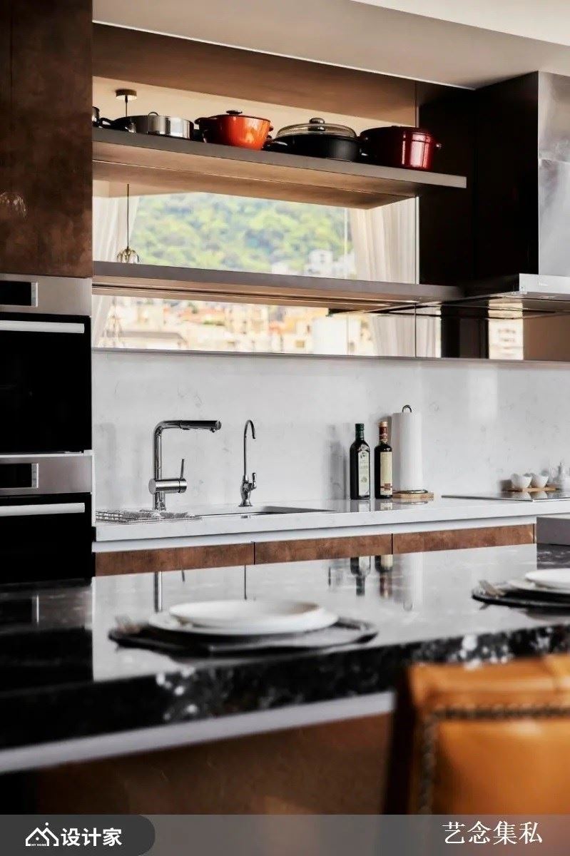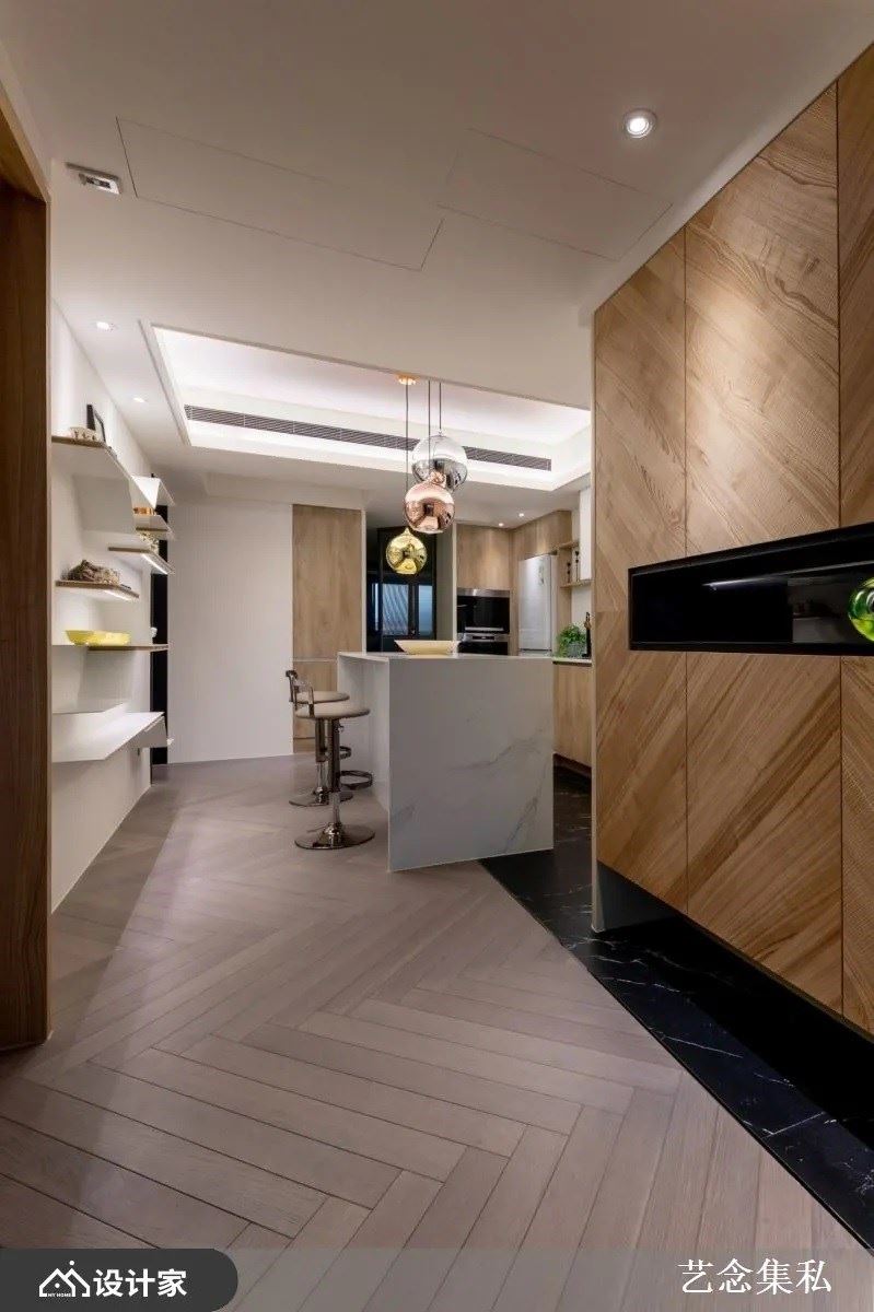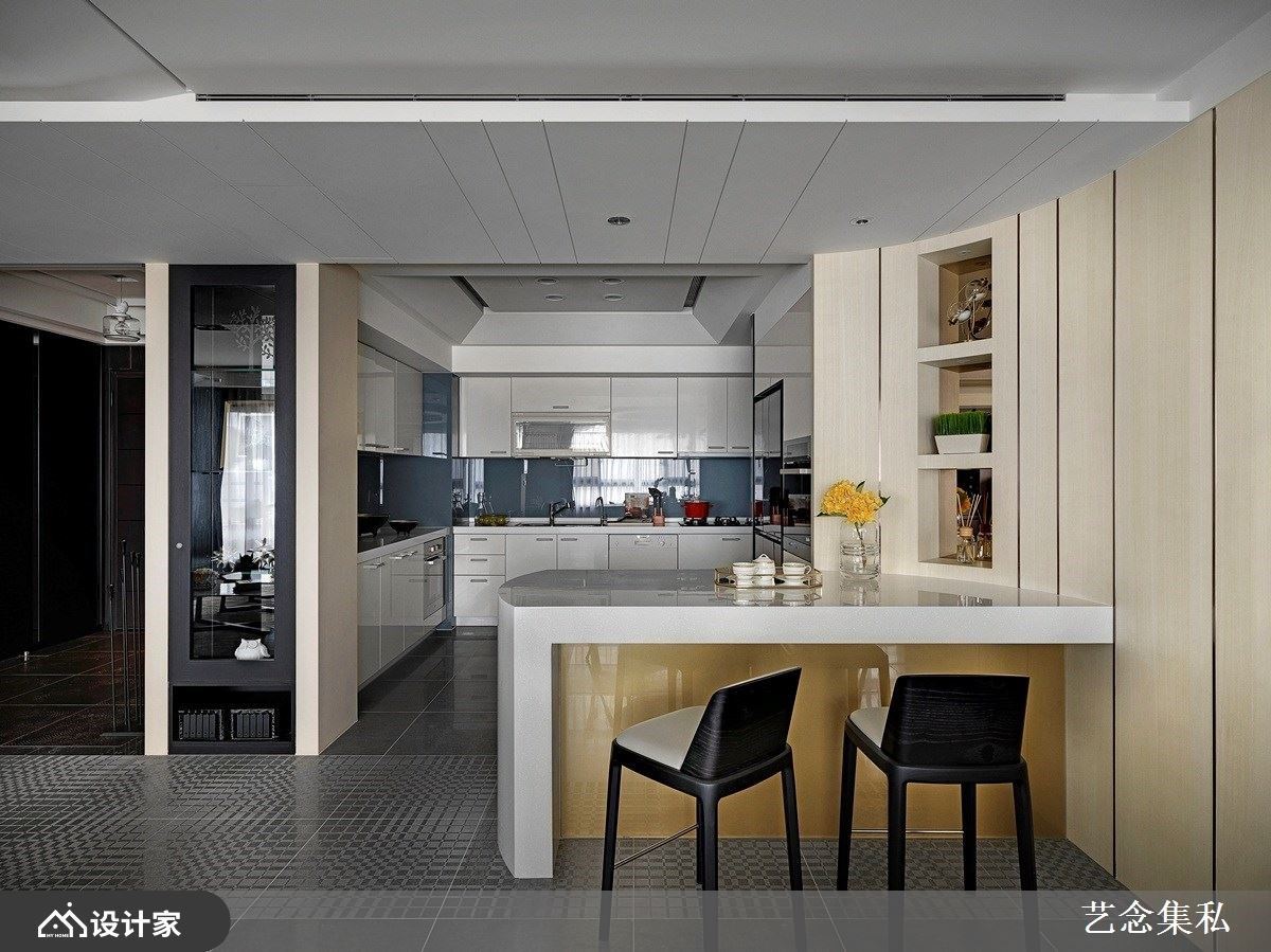 同样的坪数占比下,ㄇ字型厨房除了比一字型拥有更多变化的机能配置,而艺念集私空间设计张绍华、黄千祝总监在规划ㄇ字型厨房时,会根据屋主习惯的料理方式规划顺手的动线配置,也能将水槽与炉台分开提升安全,或是规划双炉台让两人可以一起合作享受下厨乐趣。除了充分运用ㄇ字型厨房的空间优势外,艺念集私空间设计更喜欢在餐厨之间增加中岛吧台,打造更轻松的用餐环境,像是下班回家简单可坐在吧台小酌一番,或在周末与闺蜜一起来场悄悄话下午茶,吧台气氛绝对比餐桌来得更惬意喔!