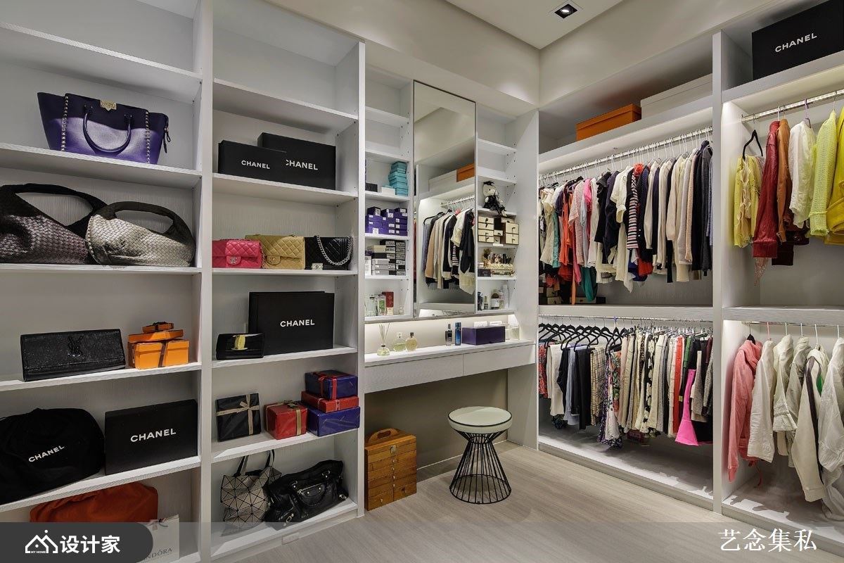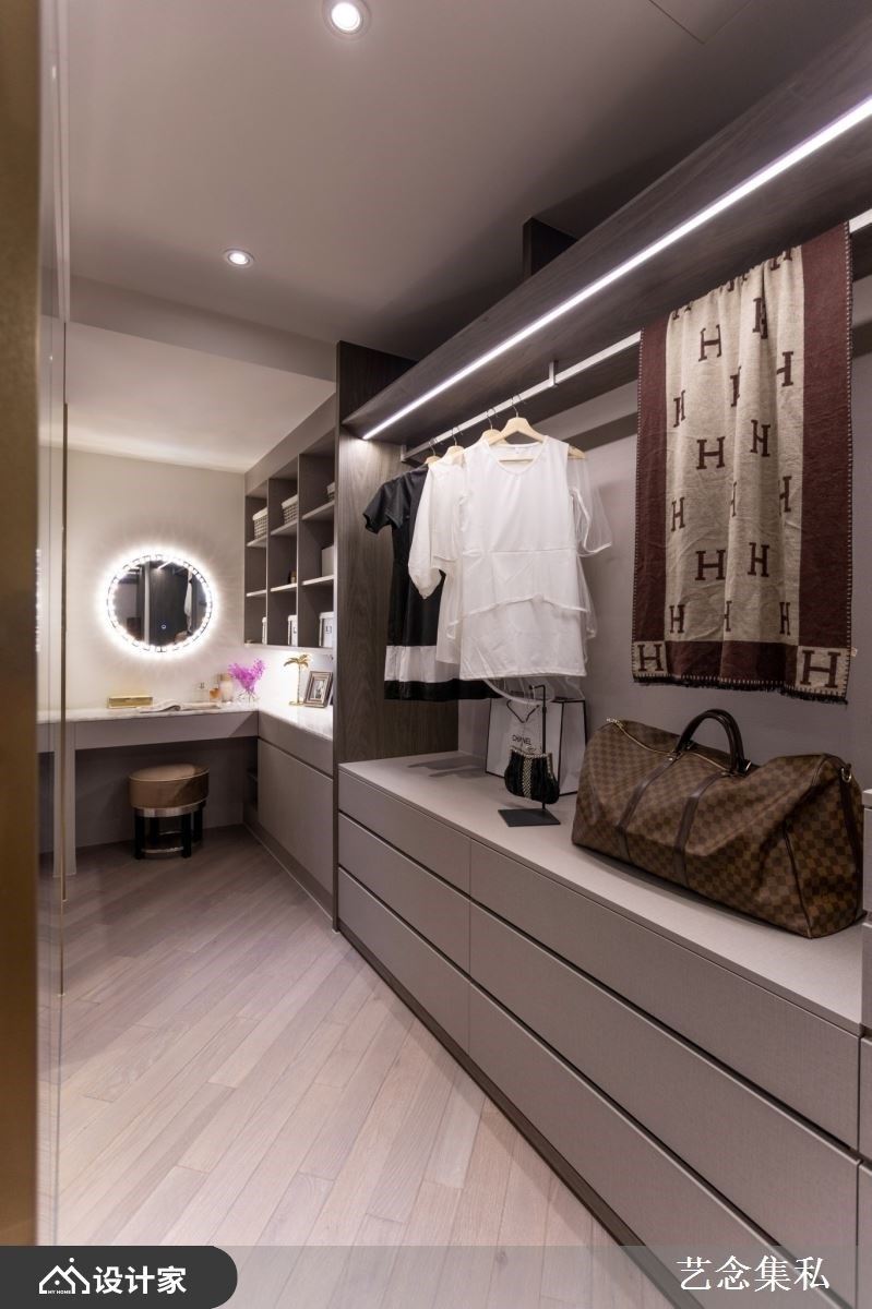 国际精品的展间总是让许多女性流连忘返,带有艺术性地陈列设计以及宽敞自在的更衣空间,也是 walk-in closet 的迷人之处。艺念集私空间设计张绍华、黄千祝总监在移植精品更衣间与展间的设计风格,用一间客房的坪数规划出独立更衣间,让屋主的鞋包和各类衣物可以精细地分门别类。化妆台与落地穿衣镜也能一并整合在独立空间中,让女性在搭配衣物和整理妆容时更更为自在从容;利用床以外的空间打造窗面衣柜墙,以吊挂方式收纳比起收在衣柜里更好拿取。