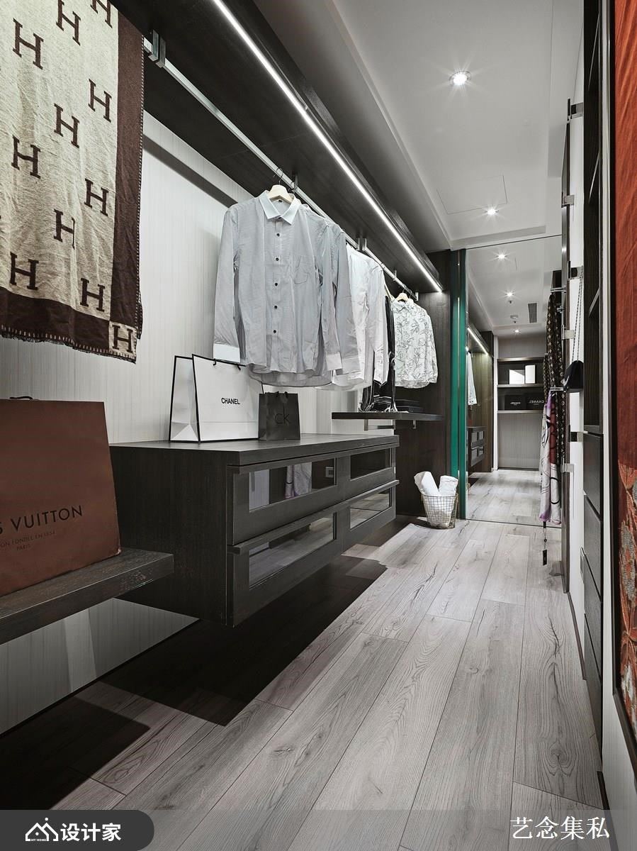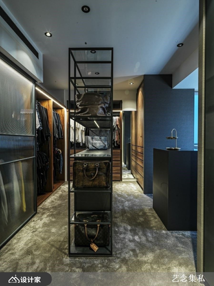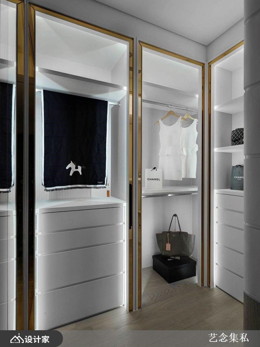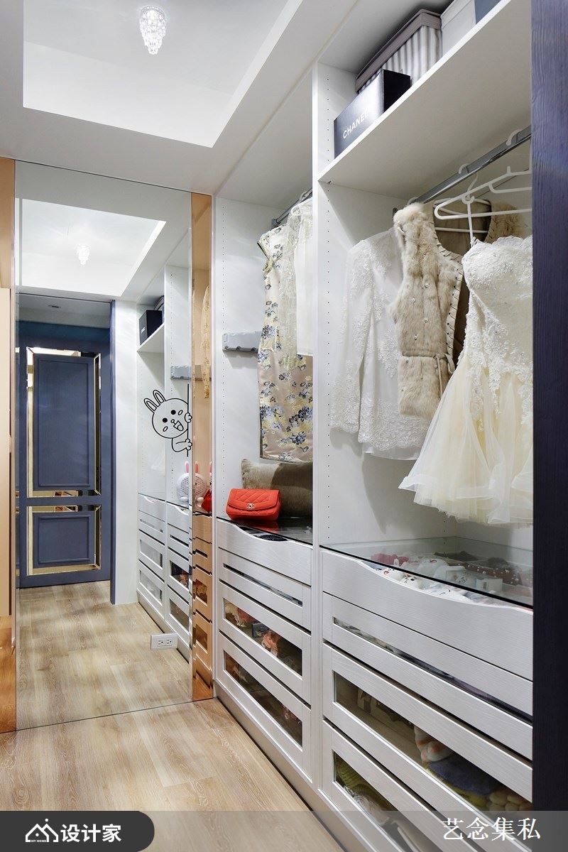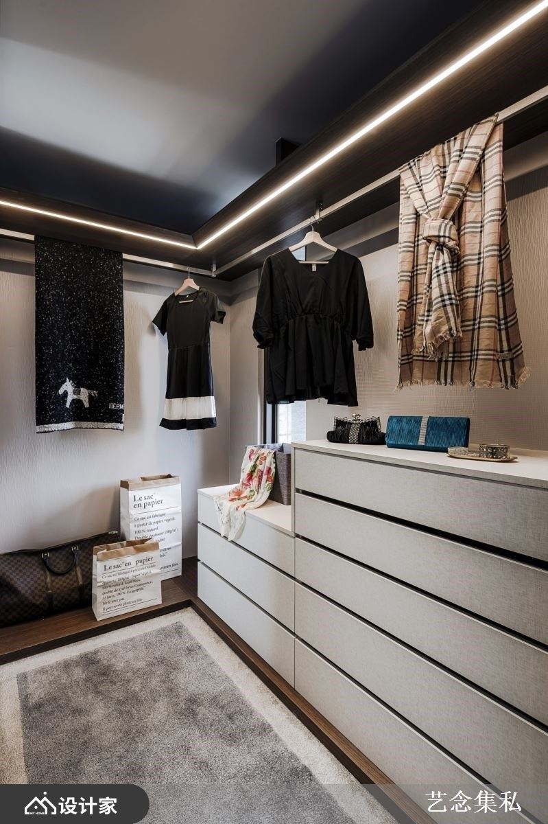 拥有独立更衣间是许多女性的梦想,但如果在卧室坪数不够充裕的状况下,要如何才能打造屋主理想的衣物收纳型态呢?艺念集私空间设计张绍华、黄千祝总监先将床的位置定义出来后,剩下床尾的长型空间或侧边廊道则可以用来打造长型的独立更衣间,利用顶天衣柜当作隔墙创造隐私性,半开放式的更衣间则可以加入精品陈列的概念,用吊挂五金夹上矮柜或抽屉等配置,满足女性对独立更衣间的向往。长型布局也能与卫浴整合,直向动线让沐浴、更衣变得更顺畅,将日常整理衣物的繁杂感变成像在逛精品衣柜一样有质感。