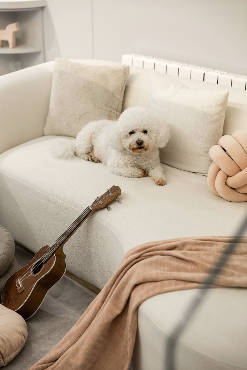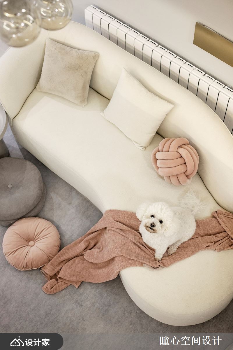 奶油色的圆弧形沙发,人躺在软萌的沙发上看看书,感受难得的慵懒与自在,而一旁的狗子此刻睡得正香。