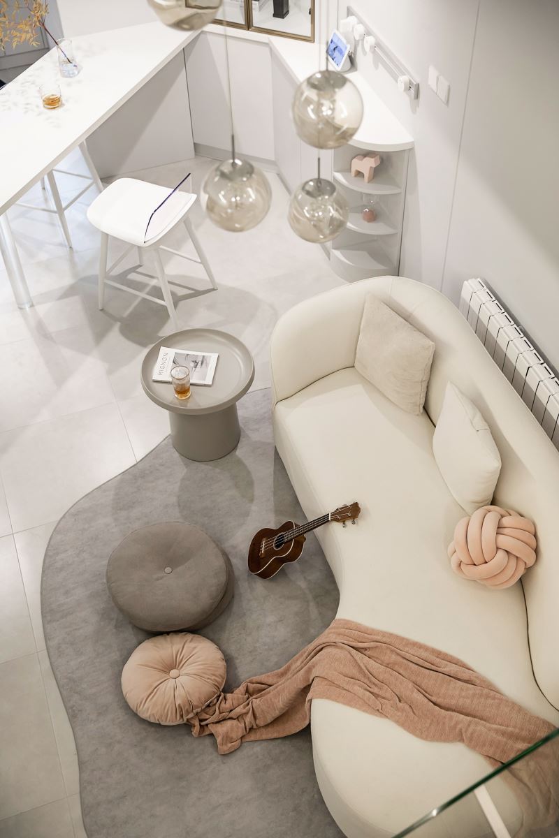 奶油色的沙发、脏粉色的抱枕、灰色圆几、圆润的弧形天花,全部采用同一种设计语言,那就是让空间变得梦幻有趣,弱化了传统客厅硬装的锋芒棱角。