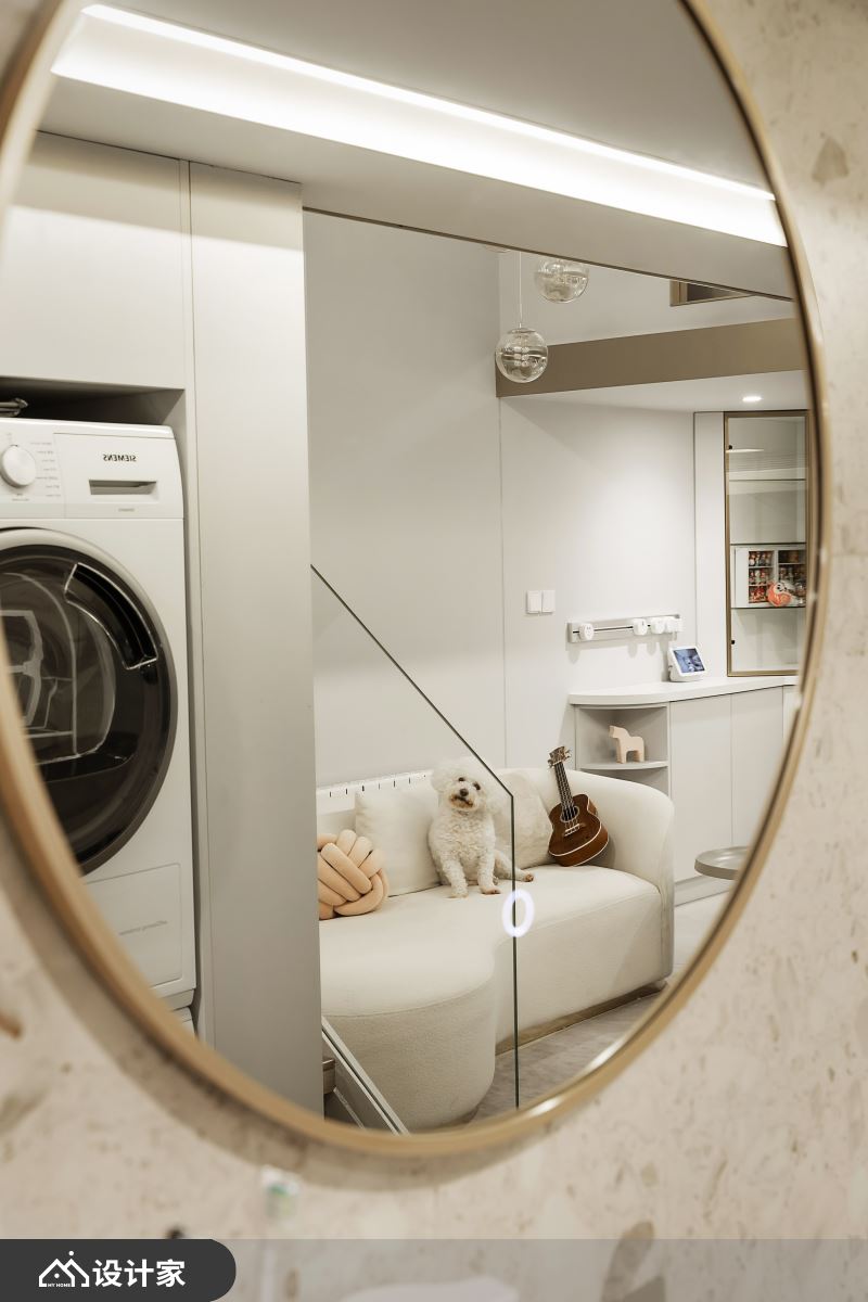 浴室柜对面是楼梯下方空间,巧妙利用楼梯下方,在此安排上洗烘套装。每次从卫生间洗完澡出门右拐,直接就可以洗衣烘衣,动线流畅又省事。