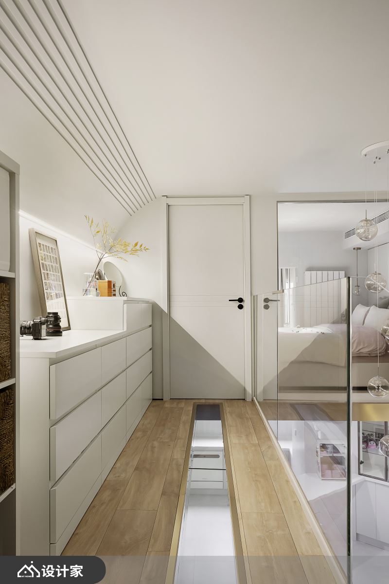同时在空间设计上,30㎡loft公寓,层高仅4.3米,相对压抑。因此无论是楼上房间面向客厅的墙选用玻璃材质,还是两个房间之间的透明玻璃廊桥,甚至挑空的客厅设计,一切都是为了营造视觉通透感,减少互动隔阂。