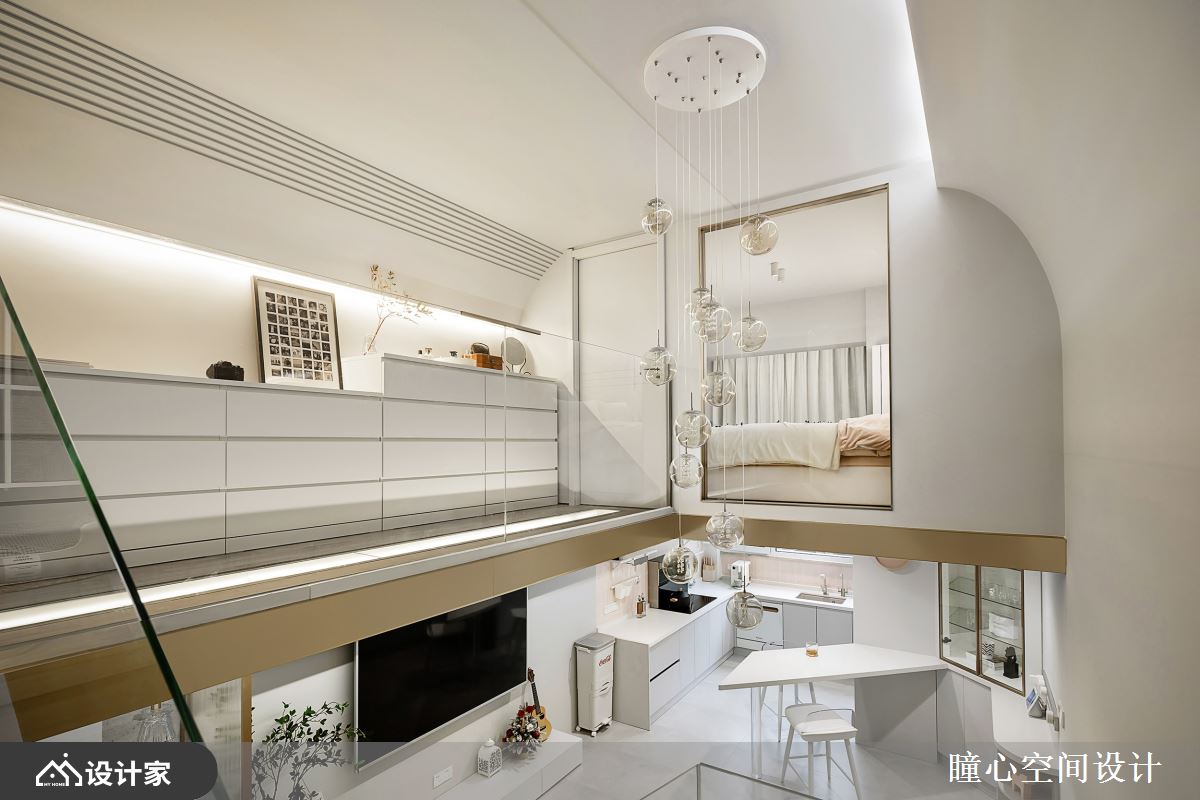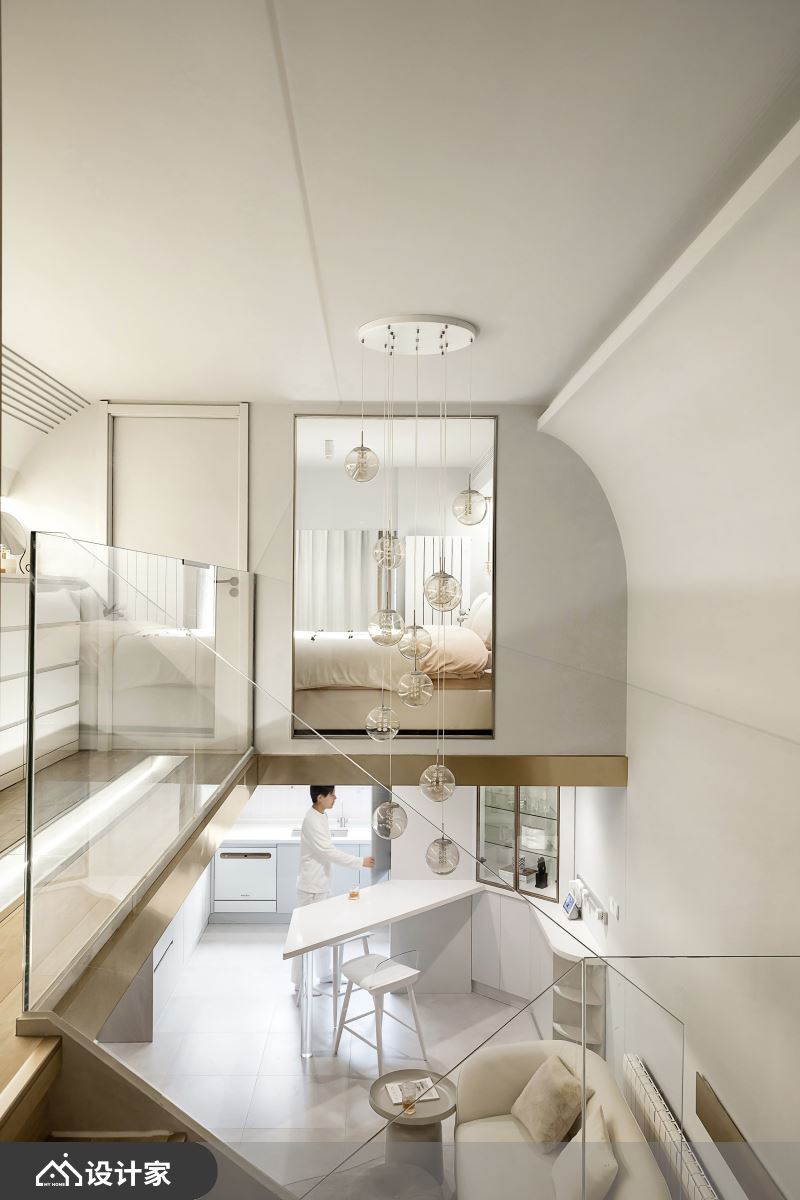 ②客厅区域采用挑空设计,小公寓有了大别墅的豪华感。楼上两个房间面向客厅的墙体采用雾化玻璃,连廊区域使用玻璃,增加采光和通透感,减少压抑。