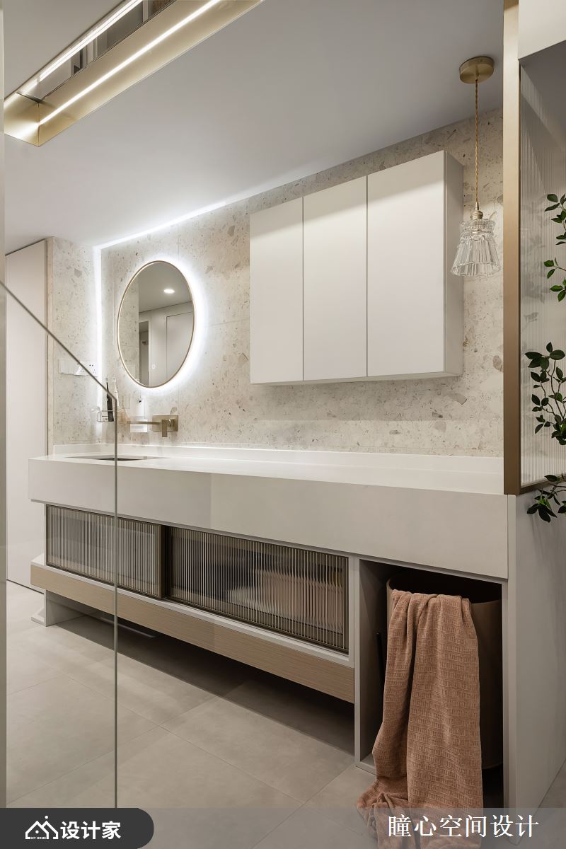 鞋柜向前一步走,是让所有女生都想尖叫想要的洗漱化妆一体柜。屋主是两个女生常住,超长的浴室柜台面,同时容纳两个人在此化妆、护肤、洗漱都完全没问题。
