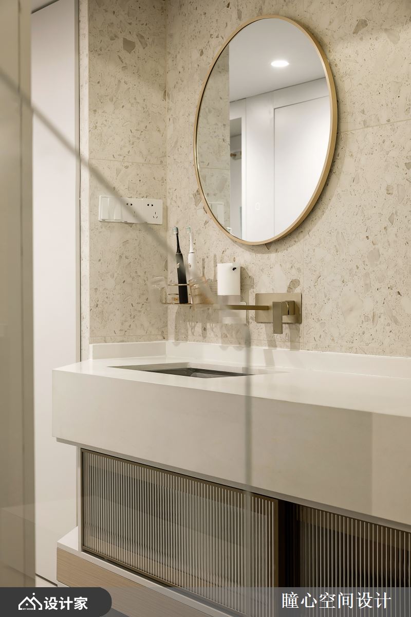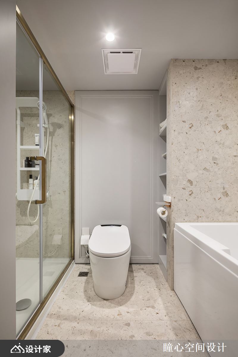 整个卫生间地面和局部墙面选用仿水磨石瓷砖,选跟瓷砖接近色的美缝加持后,拥有了大砖才有的大气感。马桶背后则是选用防潮护墙板,简洁雅致。