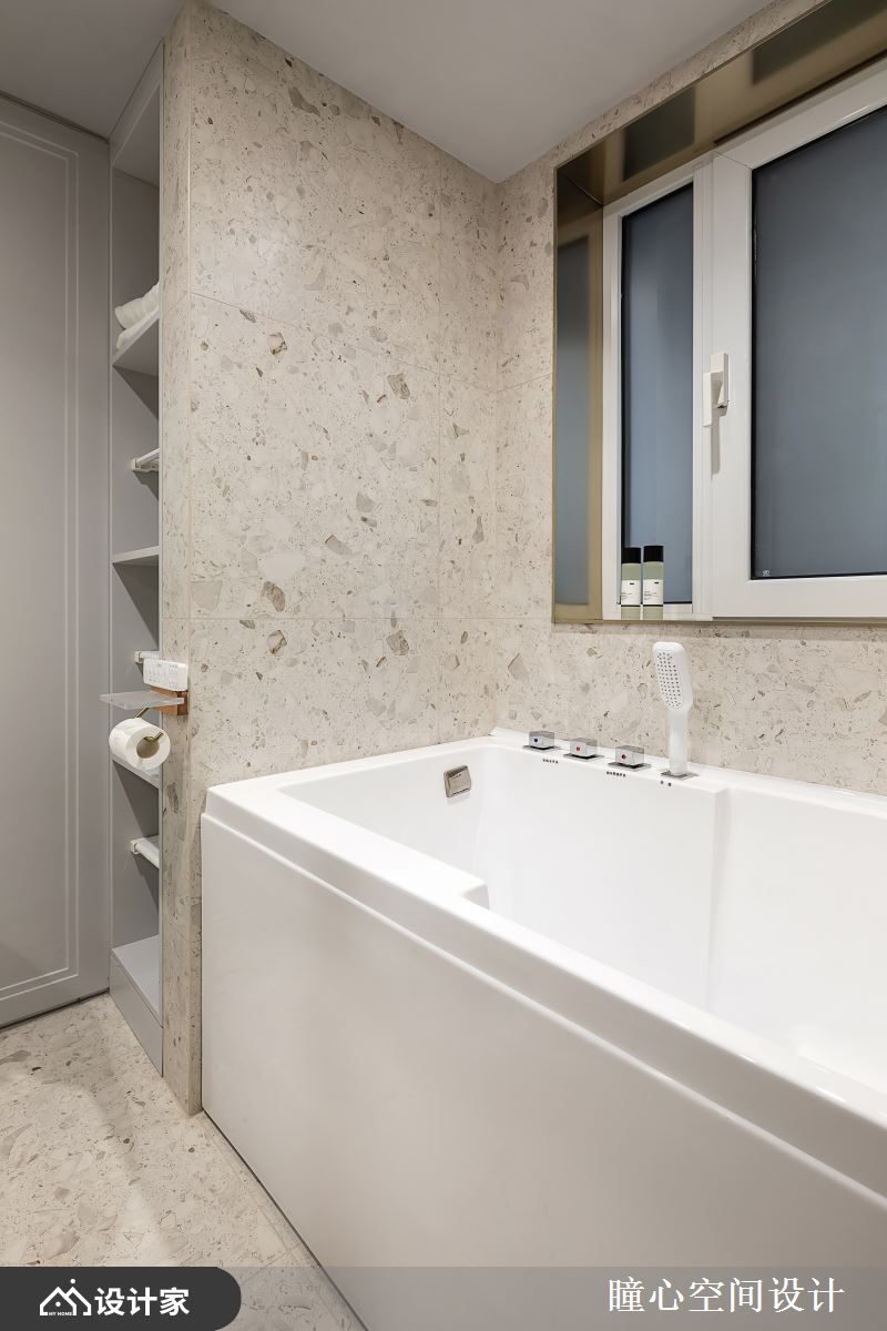卫生间面积4㎡虽然空间不大,但依然把屋主心心念的浴缸给安排上了。马桶左侧原本是排污管道,我们把它砌了壁龛,用来收纳浴巾、纸巾架等卫浴物品特别好。淋浴间的地面材质我们选用了跟浴缸一样的材质,一体成型的底座设计,让卫生间排水更顺畅。
