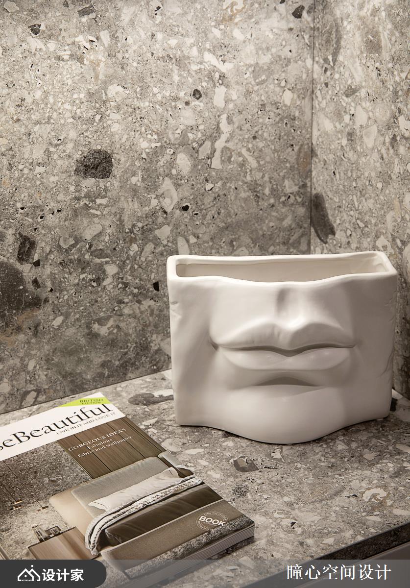 鞋柜中间留空,并且选用仿水磨石花纹的木板材质,与全屋其他空间的水磨石材质相呼应。
