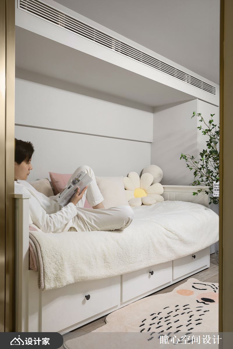 次卧小而精致,简约不失实用,坐卧两用的沙发床刚刚嵌入墙体空间。
