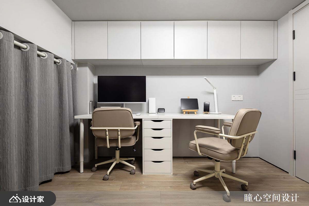 沙发床对面区域设计了一排吊柜+双人书桌,两个屋主同时在这里办公,打游戏都完全没问题。