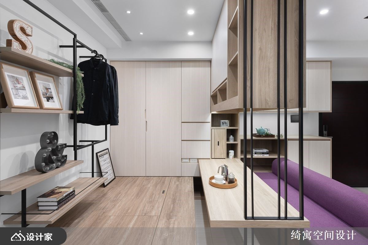 小空间的玄关寸土必争,虽小,但也要成为体面生活仪式的过渡空间。进入大门后,左侧是到顶的玄关柜,能减少入门的凌乱。右侧是换鞋凳,方便屋主进出门随时换鞋的需求。