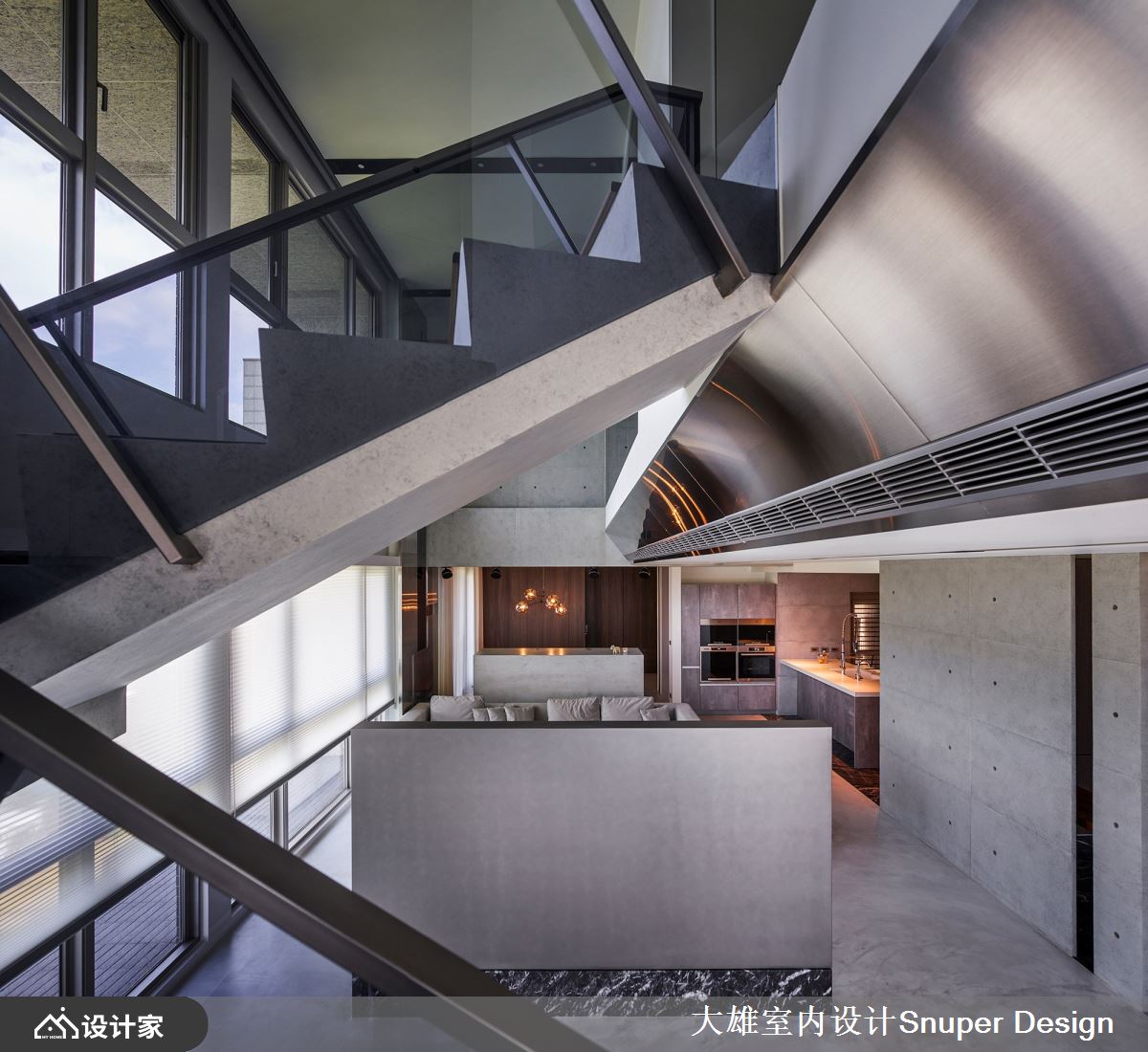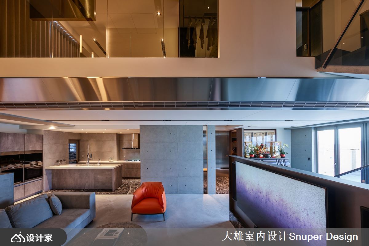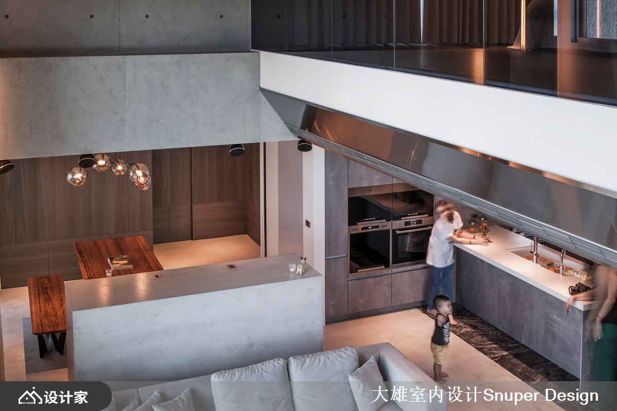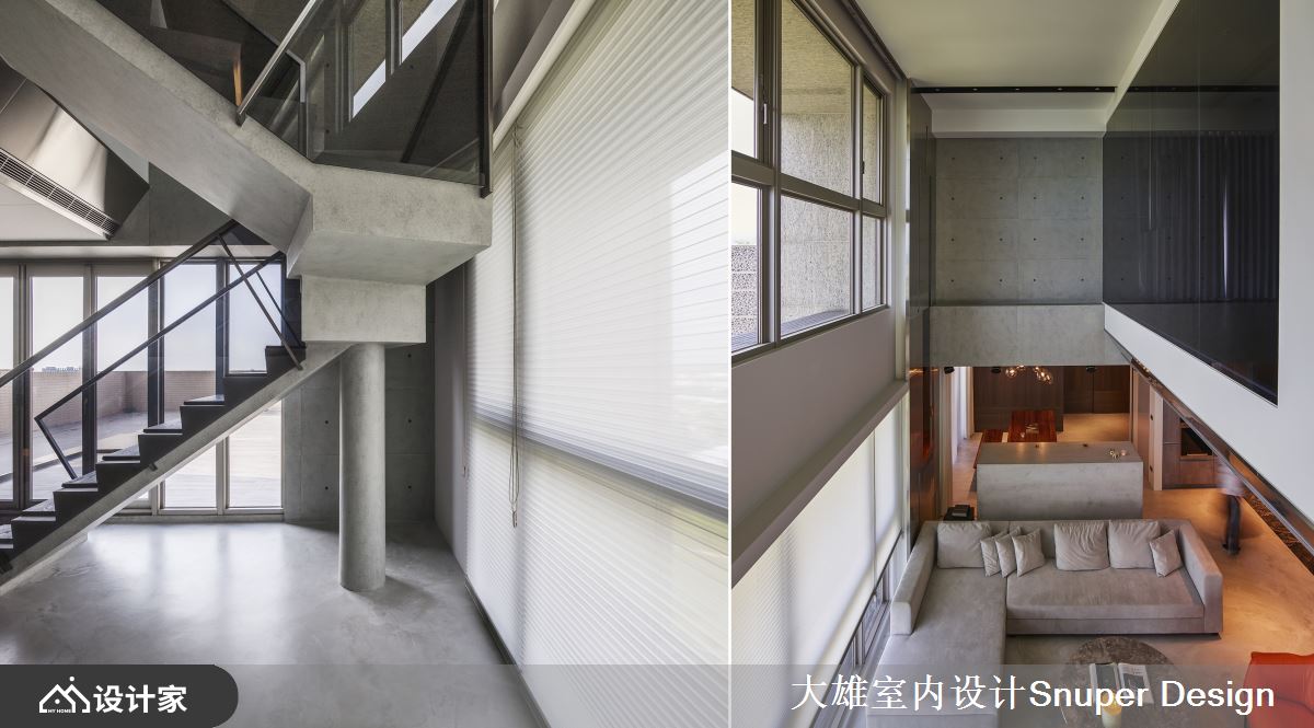 设计的第一个剖面,就是平面策略。 我们将这个空间摊展开,全案拥有两个楼层,屋主期许将公私领域独立分属,因此率先决议以楼层区隔作为分岭,一楼为公领域及小孩房,二楼则以一玻璃盒子的概念,成为夫妻俩专属的私领域。同时,更顺应屋主的喜好,以精致工业风扩展至全案。