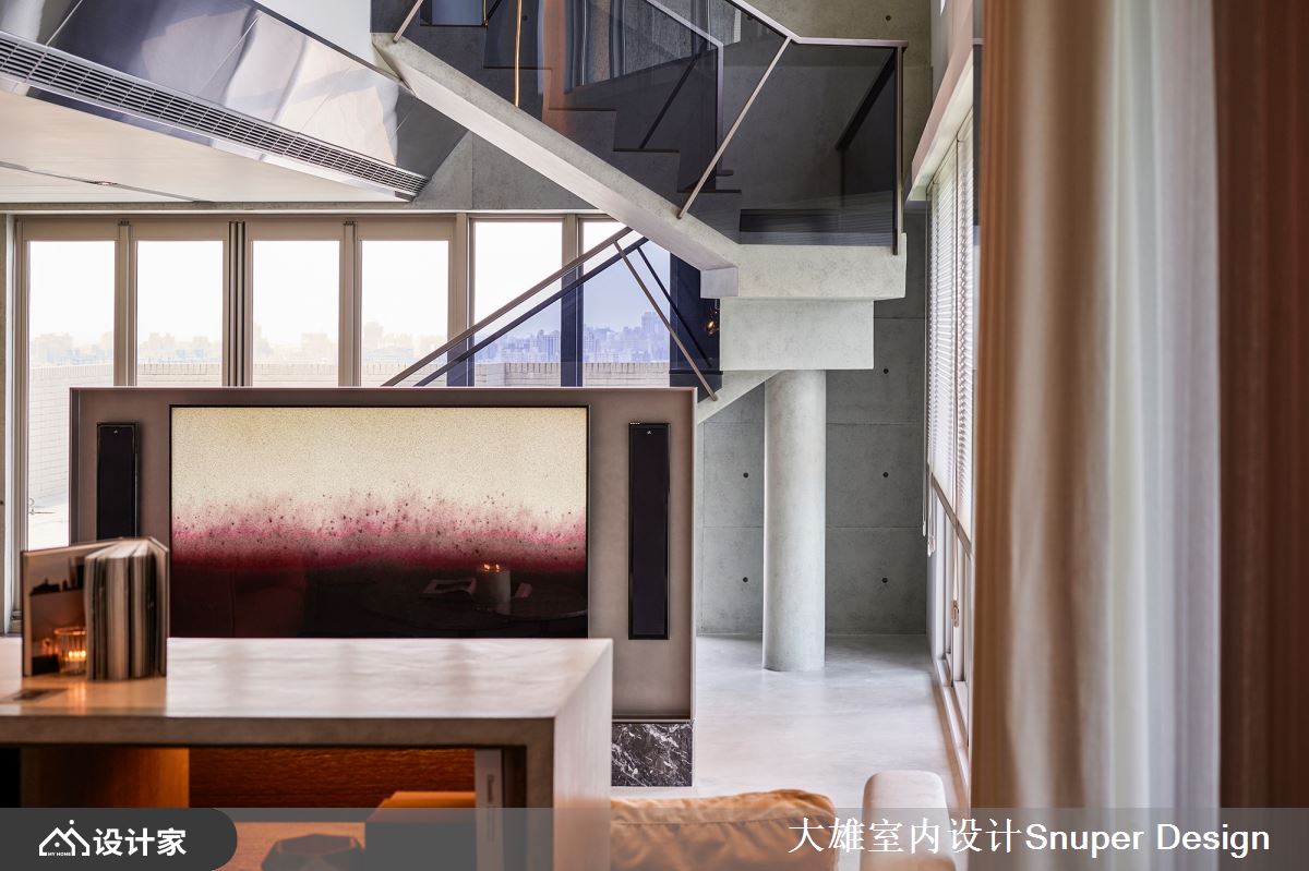 考虑居住者对楼梯设计的喜好,并兼顾风水考虑,决议重整格局,廓清一楼的动线与布局,首先挪移楼垂直动线的位置,并以「份量感」定义楼梯设计,从铁件、折板到水泥, 楼梯最后像一件雕塑般, 顿处在空间的底端。而电视墙的位置几经斟酌后,以半高、不做满的姿态落地。
