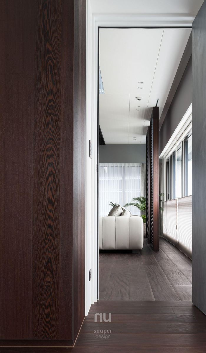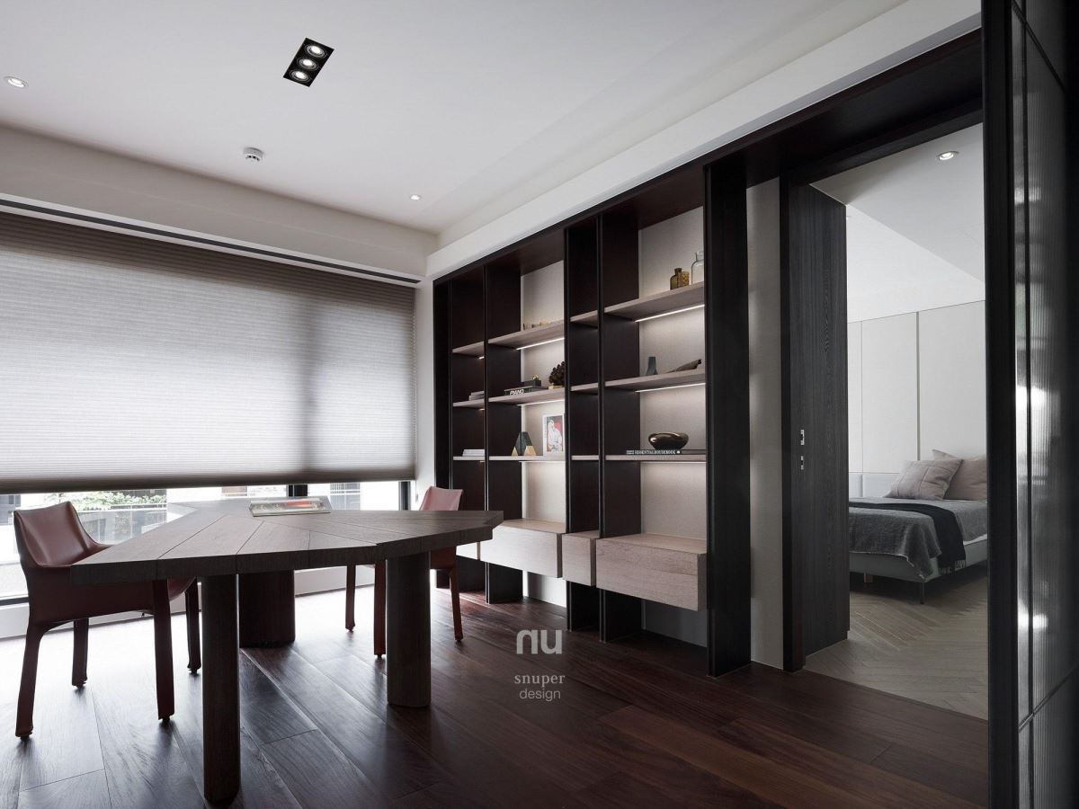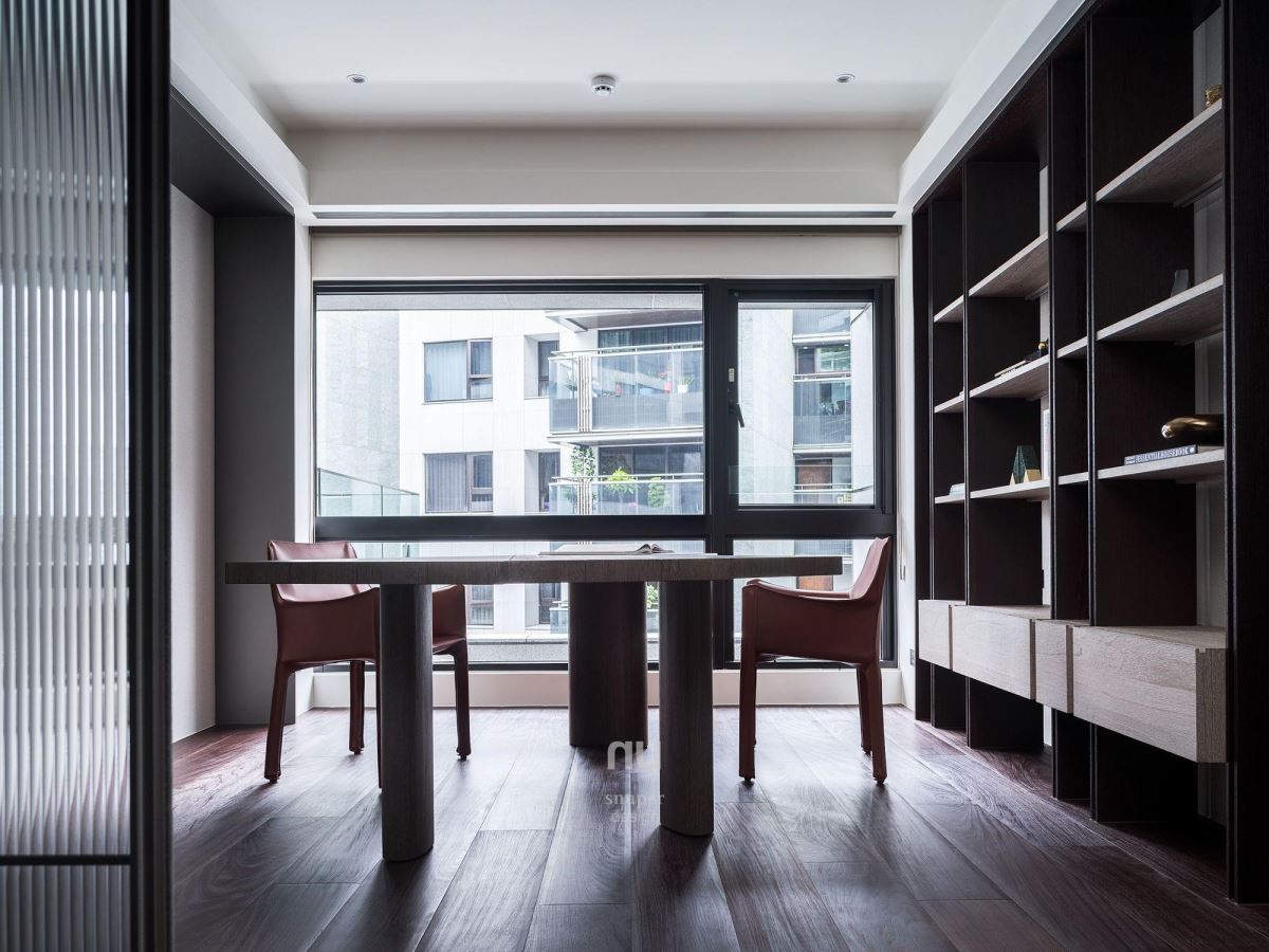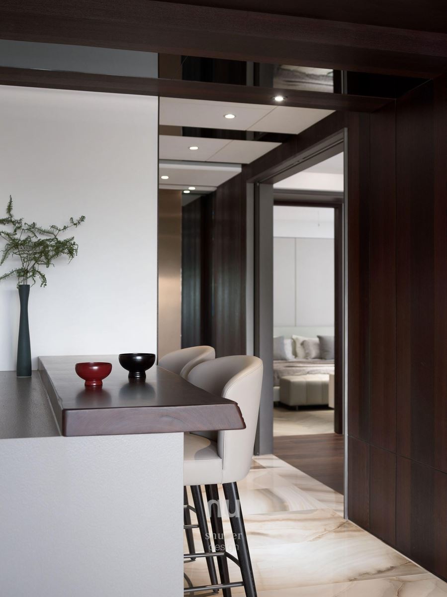 客厅电视墙采取立体的石材堆砌,呼应着绿意盎然的山峦远景,点亮空间的自然气质;餐厅主墙藉由灰阶的特殊漆面与南洋红木调,打造能够摆放小家电、生活用品的收纳端景。作为公私领域的转折点,中岛吧台提供居住者一处静心休息的角落,一旁半透明拉门隐藏了后方的书房和卧室,营造完整不受干扰的私密空间。