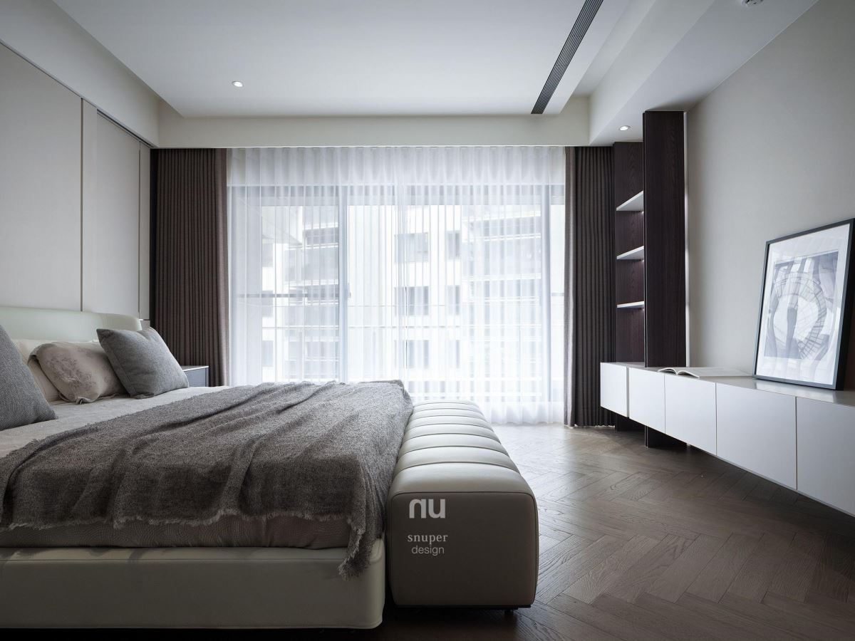 卧室采取人字拼木地板,铺排出与众不同的空间表情,再搭配低彩度的家具与墙面,形成舒适惬意的睡眠环境。