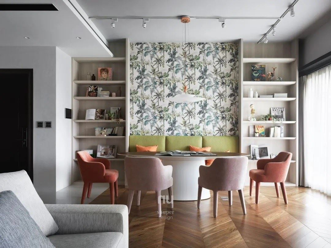 位于玄关和客厅之间,餐厅装饰植物图腾的特色壁纸,搭配草绿色卡座、圆形餐桌,营造出多采多姿的自然韵味。