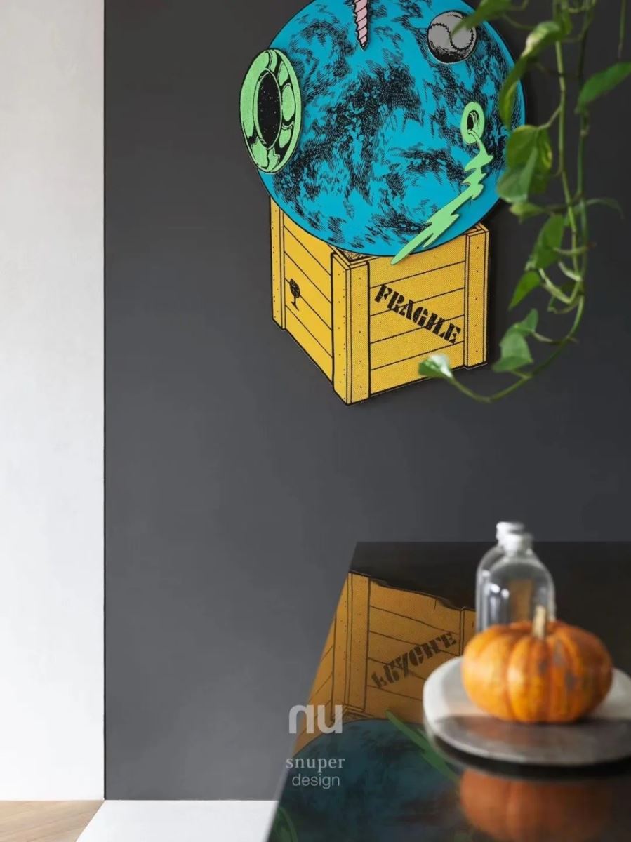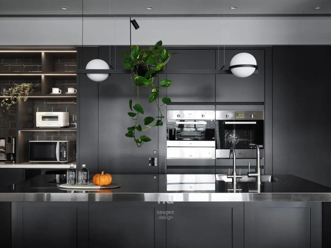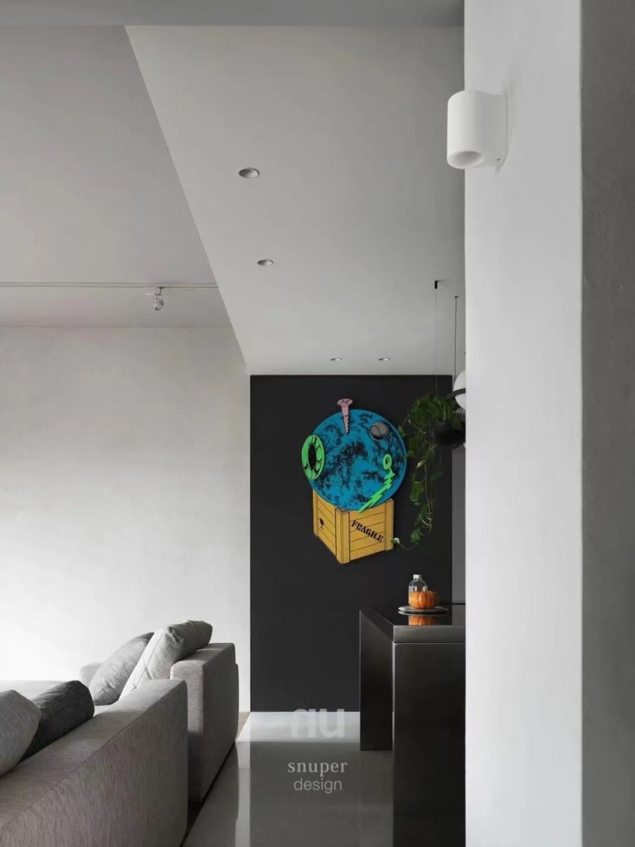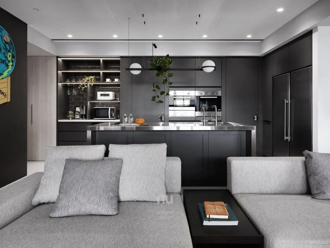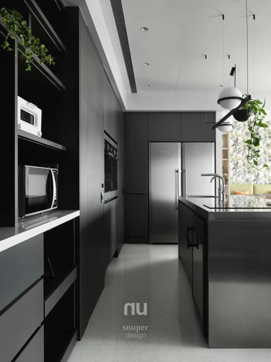 厨房选择深色厨具及中岛吧台,衬托出灰阶手工涂料漆面的朴实感,墙面则布置日本艺术家金氏彻平的作品「游戏、舞与结构」,搭佐生意盎然的植栽,塑造出烹饪区域的趣味亮点。