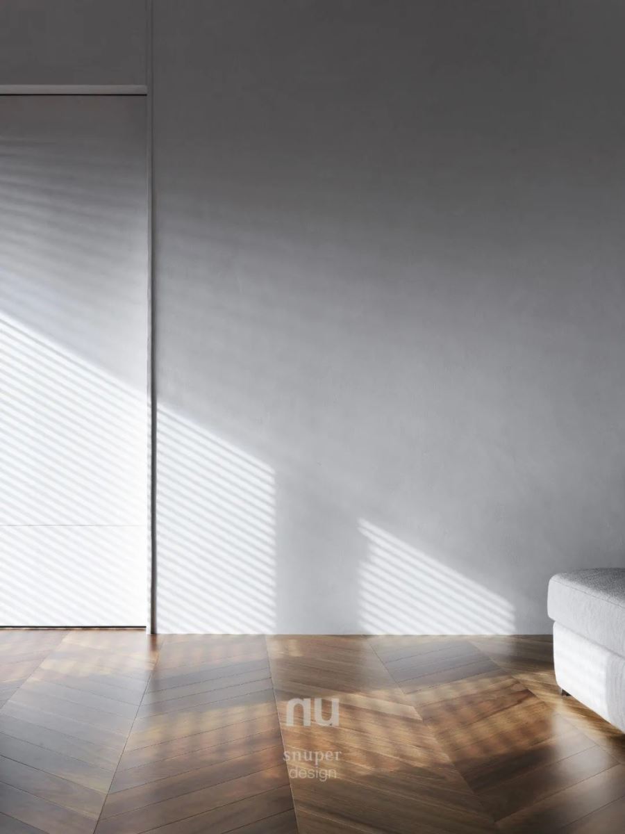 玄关采用水磨石地坪,打造风格显著的第一印象,搭配右侧的木质玄关柜,散发温暖的自然调性。客餐厅铺设鱼骨拼木地板,引导流畅的室内动线,同时保持空间的开放宽敞,让亲子可以坐在地上玩耍交流。