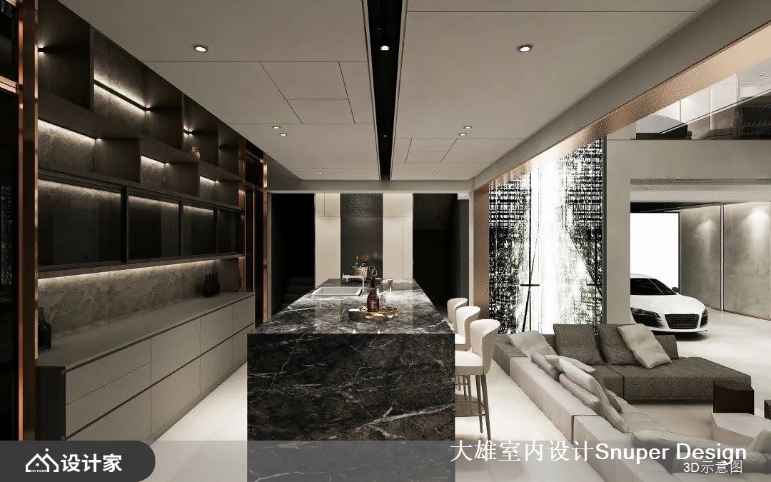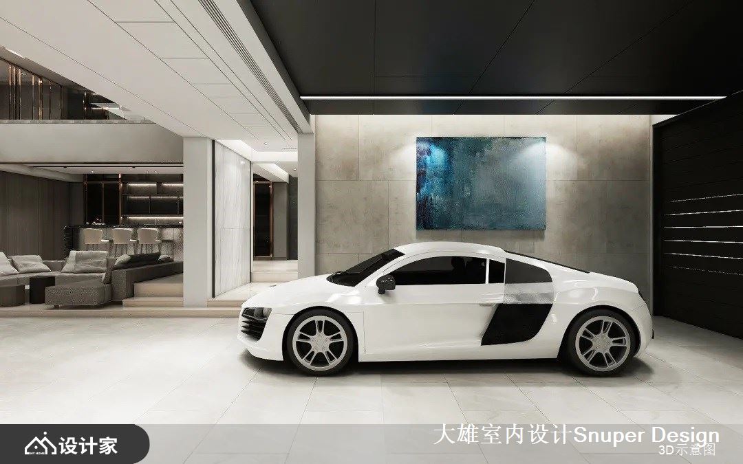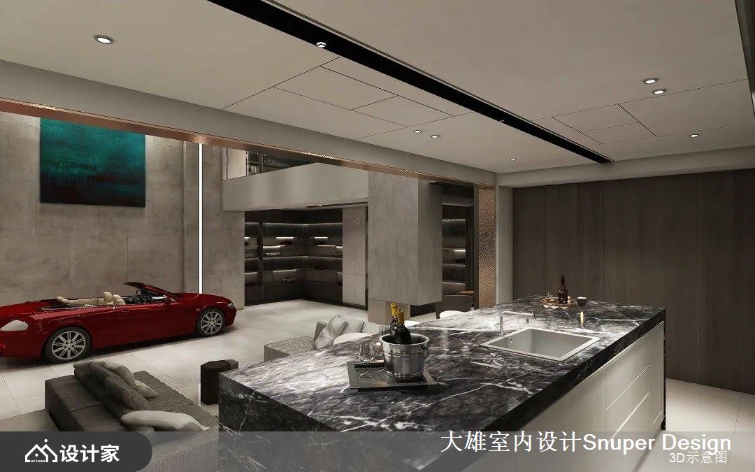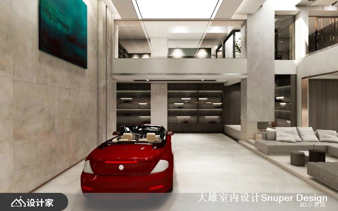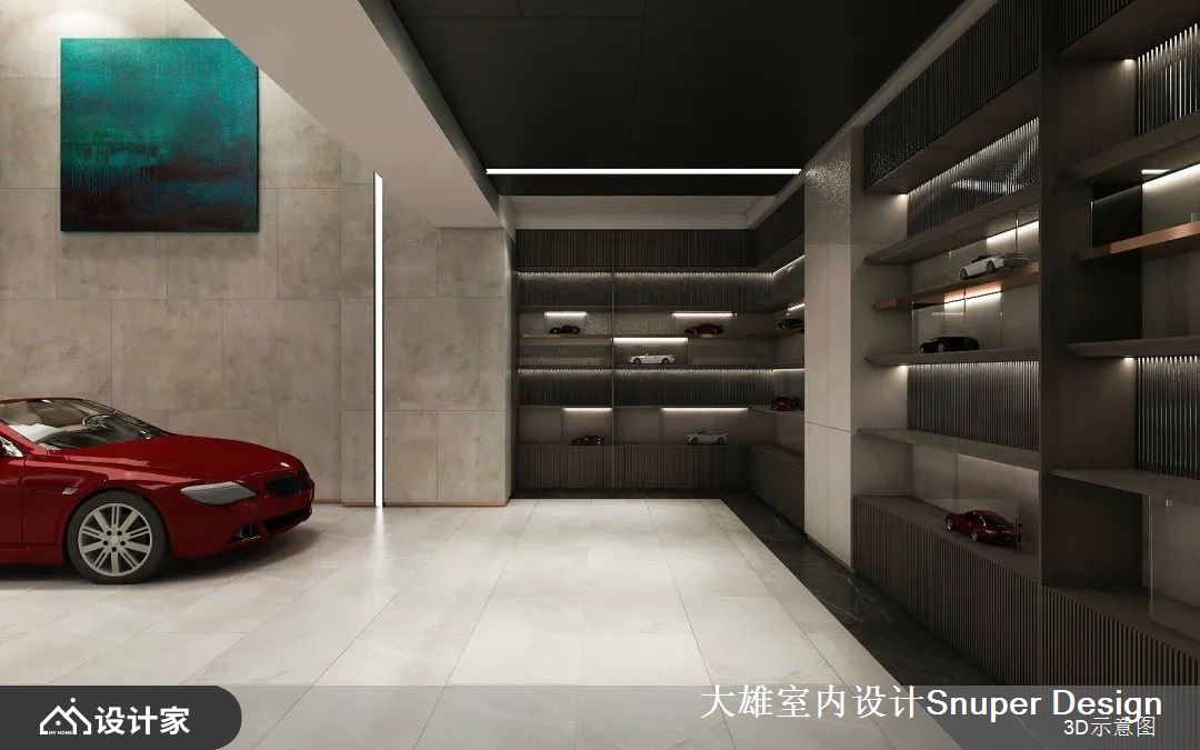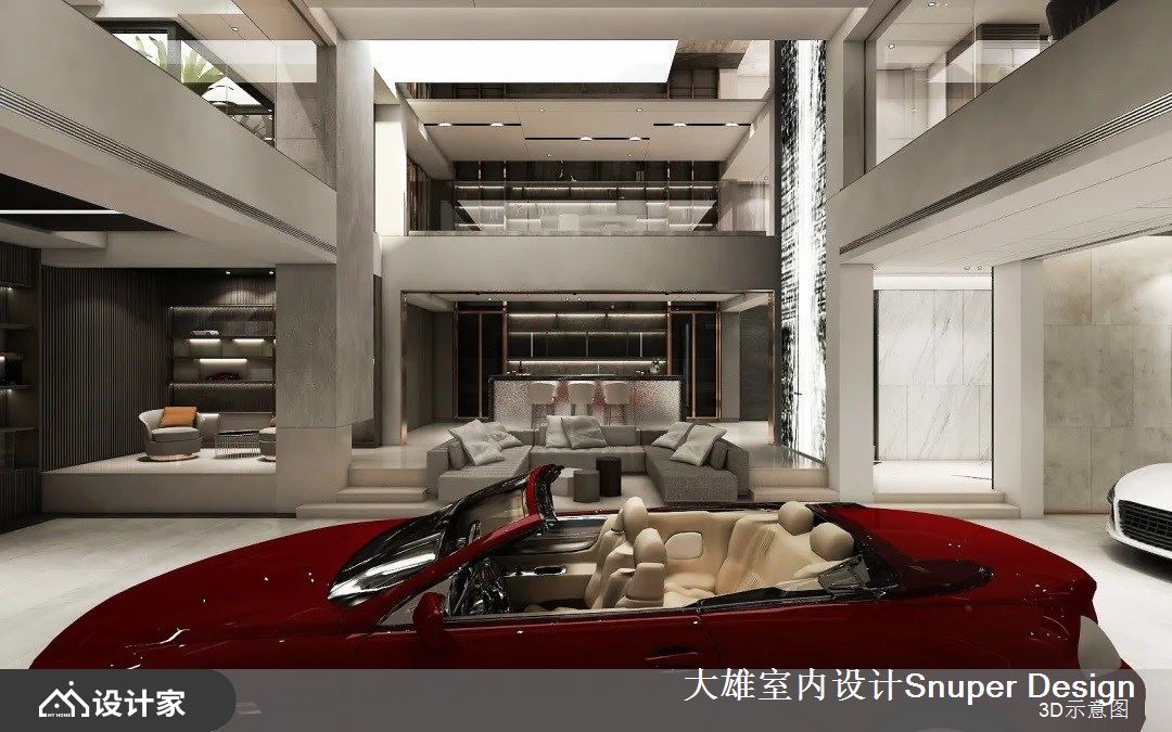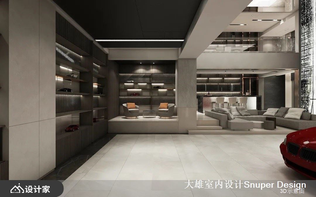 或清茶一盏、或花间置酒,最纵情自适的社交,充分展现中国人的好客热情、对生活美学的沉淀。负二层的会客厅,是最主要的社交空间,家主的跑车收藏置放于此处,社交核心围绕于此开展。整体空间功能复合,具备品酒、雪茄、用餐、展示等多种丰富机能。