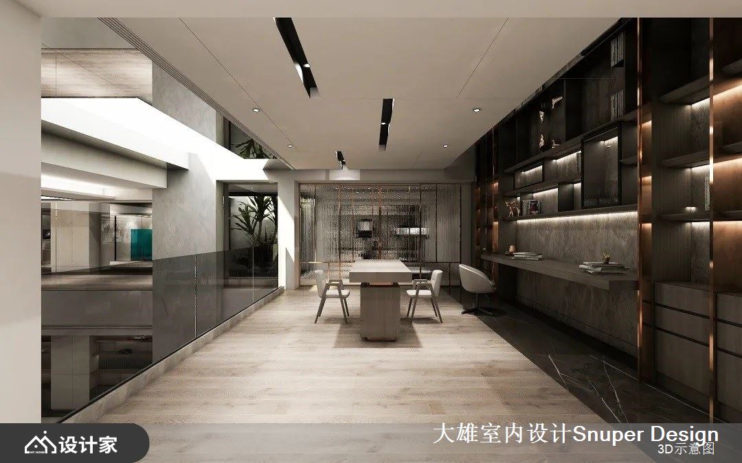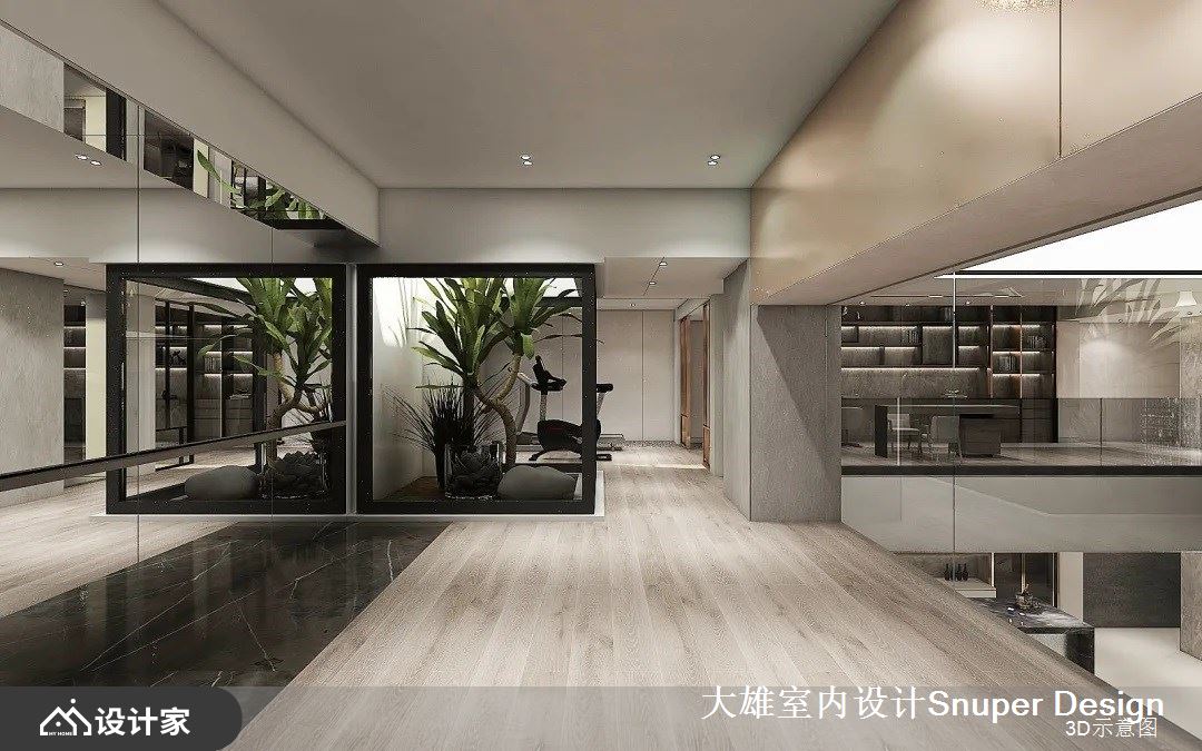 两倍的层高,使用玻璃帷幕围合出高阔的视觉感受,展现现代而精采的形制。有鉴于后疫情时代的需求,过去那些属于公共设施的需求或礼宾服务,为了维持“社交距离”降低主动式的交流,如今纷纷搬移到了居住空间中实现,负一层围绕挑空区是起居室、书房和健身室,并通过建筑优势,留有透光天井,在阳光洒落处安排为室内温室,通过冰柱型态的玻璃作为推拉门,柔和的光线带来舒适暖意,也串起场域间的关系。
