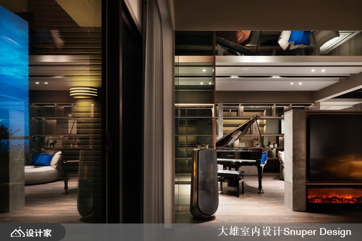 电视墙伫立于客厅与交谊厅之间,下方搭佐壁炉设计,半高量体不顶天且让出两侧动线,伴随镜面铺陈的天花大梁投射、传递室内景致;一旁衬以玻璃的展示柜体,通透无碍视觉衬出后方黑色钢琴,一路穿引至书房,形塑宽敞开阔的室内氛围,创造人文质感的生活温度。