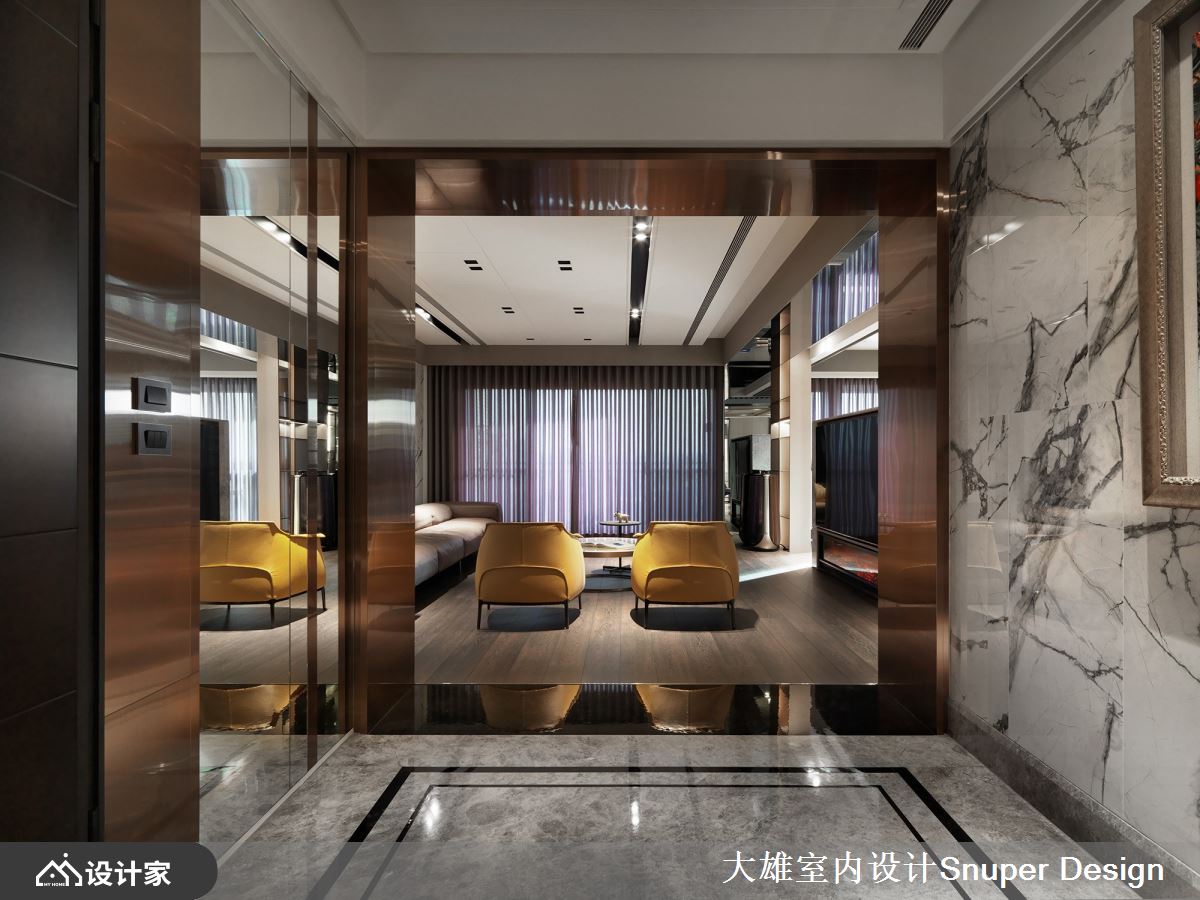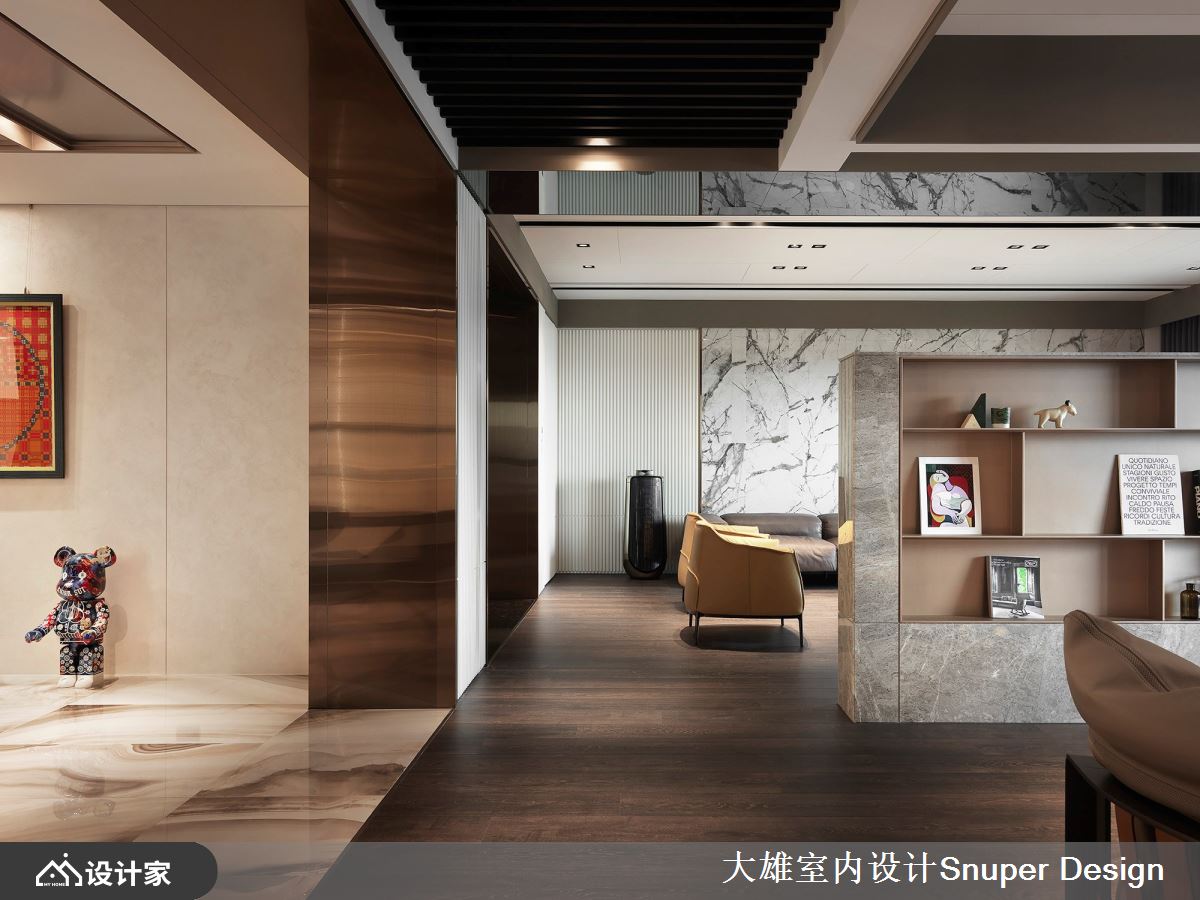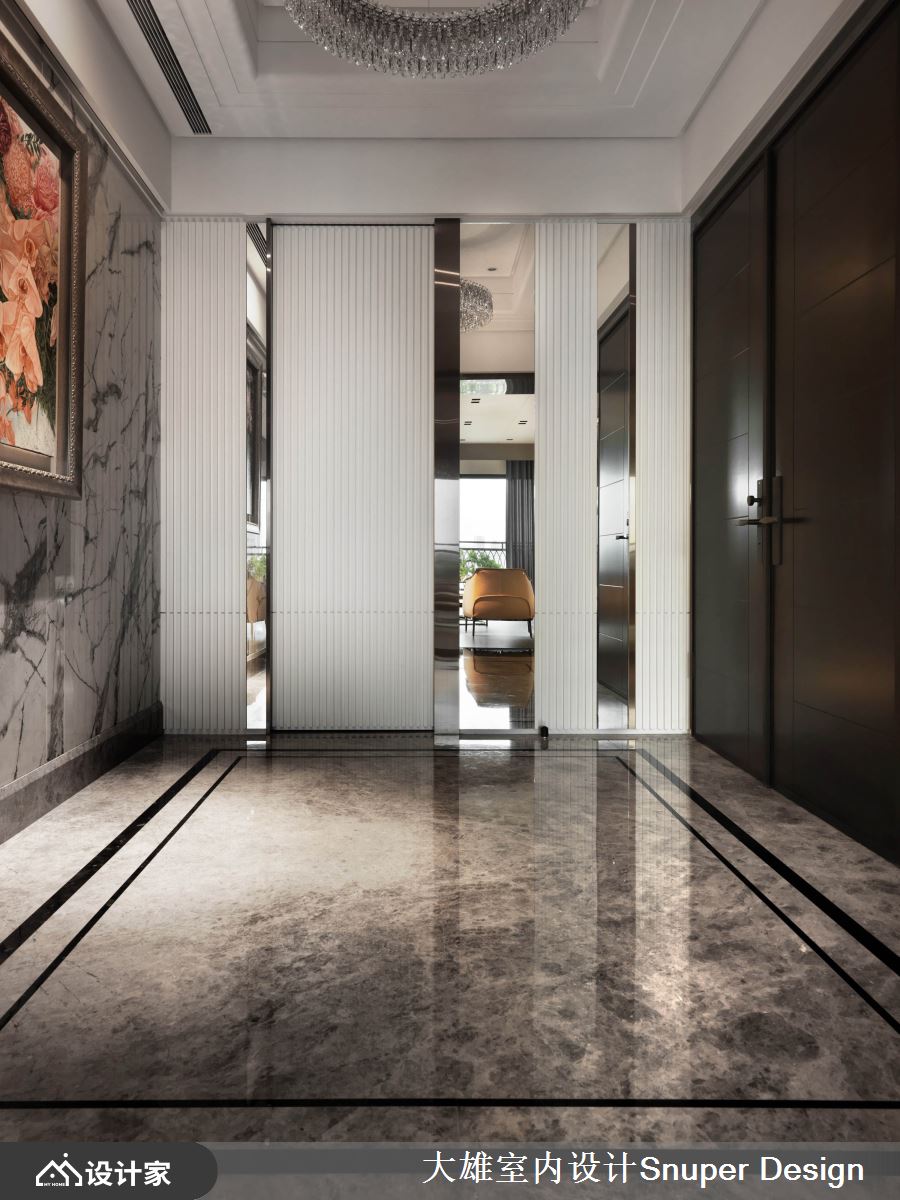 玄关透过不同石纹妆点立面的排序,搭佐石材地坪辅以古典元素滚边的细腻巧思,营造美学层次;公领域的分界处则以镀钛框,透过现代质感平衡古典内涵。右侧配置独立鞋间,外观上利用波浪板分割搭配镀钛,绽放精致神采,部分贴附镜面材质,投射、延伸室内场域,拉阔视觉尺度。