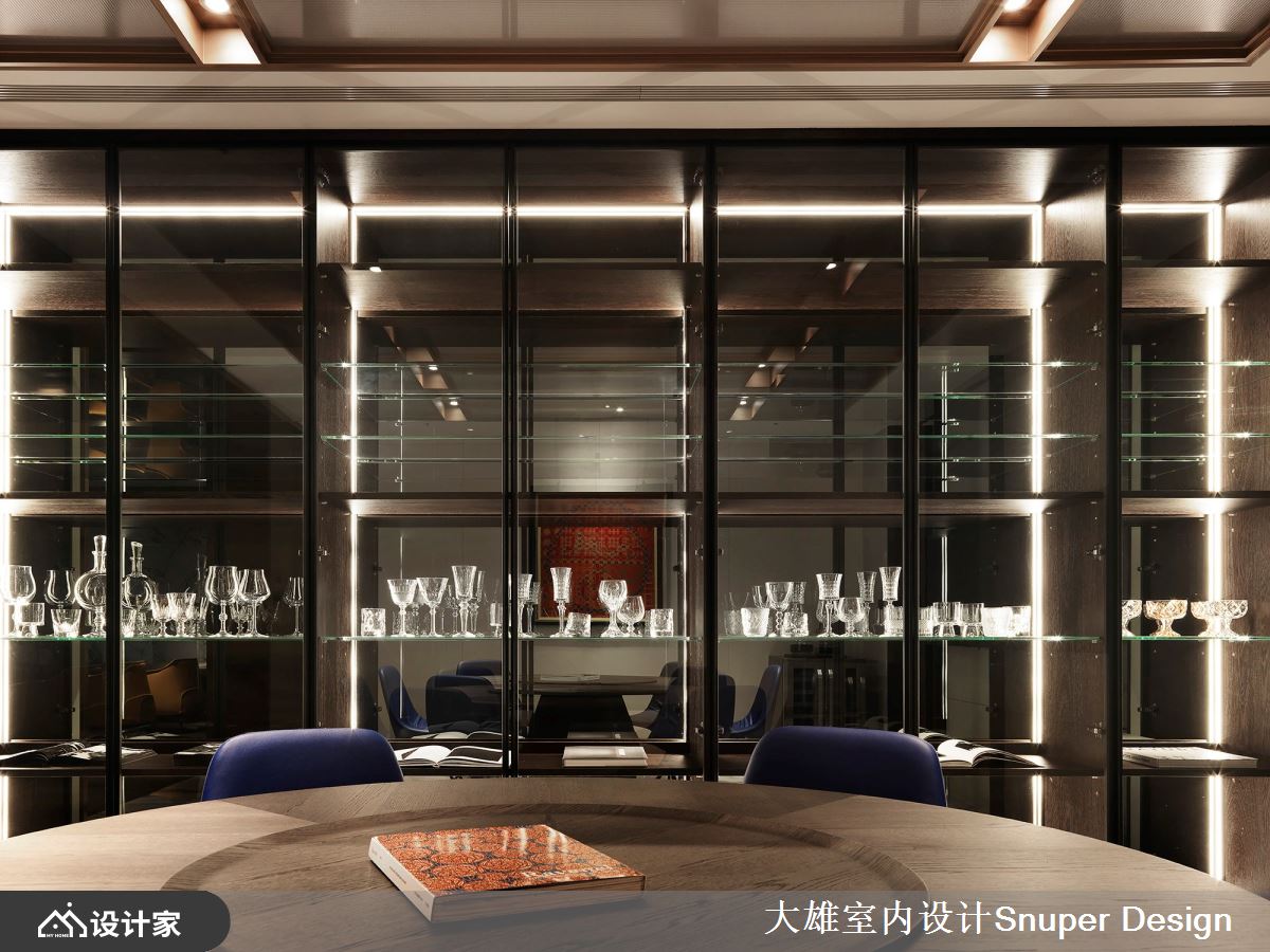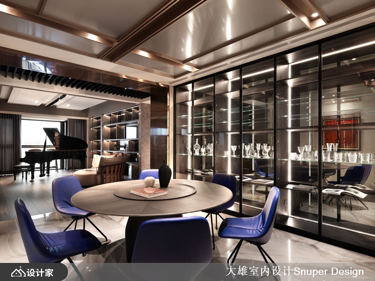 餐厅地坪铺设纹理强烈的进口砖,采用崭新排列手法,伴随侧墙打造整面展示柜,镜面为基底、搭配金属框玻璃门,佐入光带设计,呼应整体奢华、时尚调性。安排经典的工艺家具 Molteni&C 餐桌与宝蓝色 Poltrona Frau 餐椅,注入丰富情感的义式美学;天花板结合仿天光照明与嵌灯设计,可随时切换明亮光景,抑或具韵味的风尚飨宴,擘划隽永非凡的气韵。
