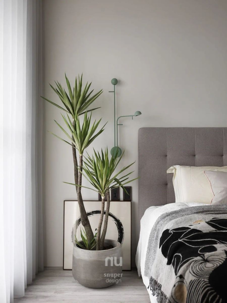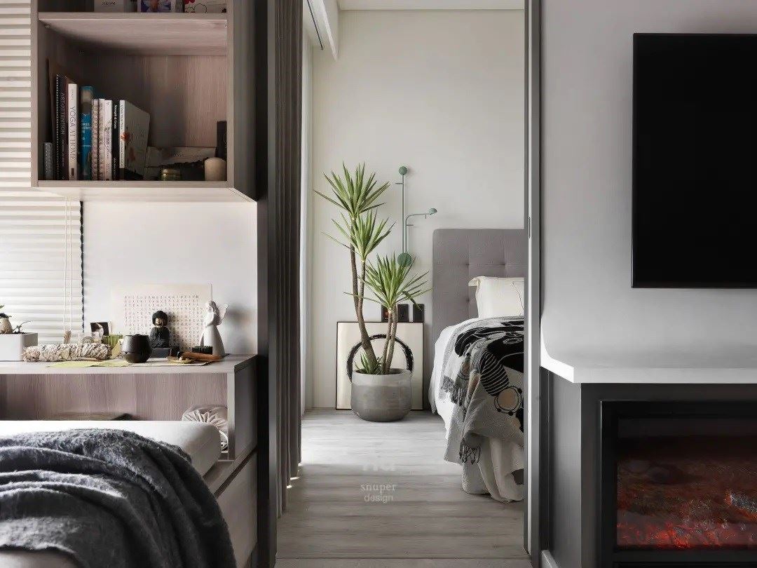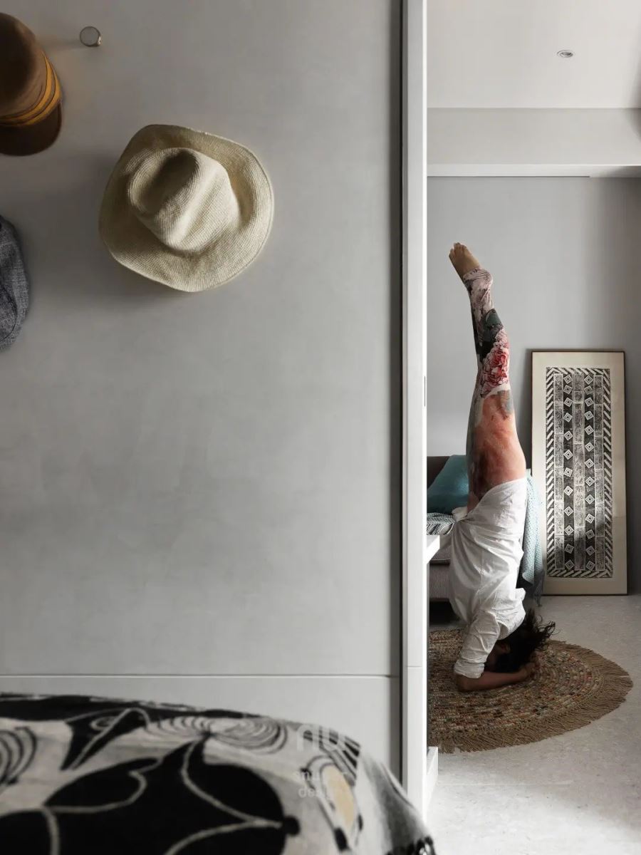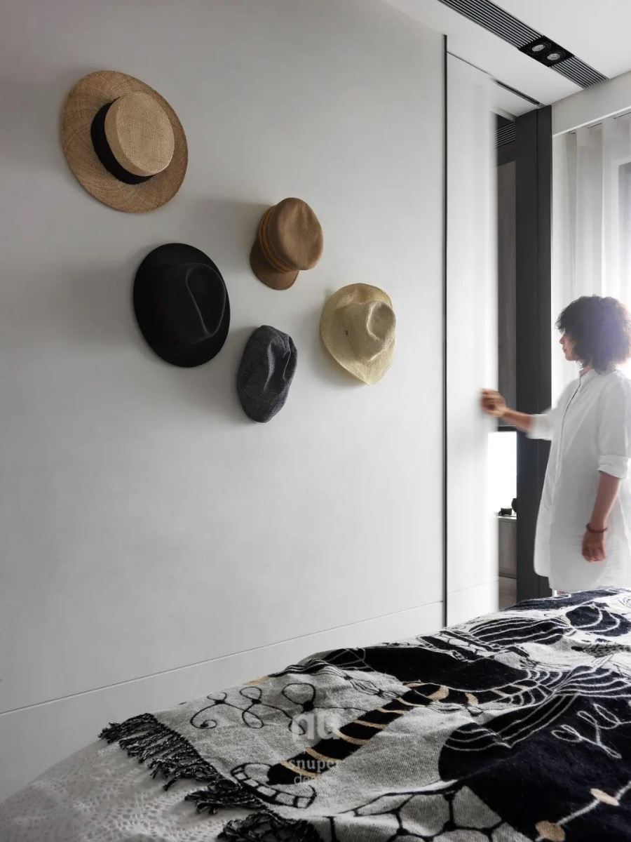 在卧榻区做瑜珈、书房的墙面摆设艺术画作,还有主卧室的床尾陈列出一整面帽子展示墙,局部还有植栽点缀,让生活的轨迹填满室内,写下家的温暖故事。