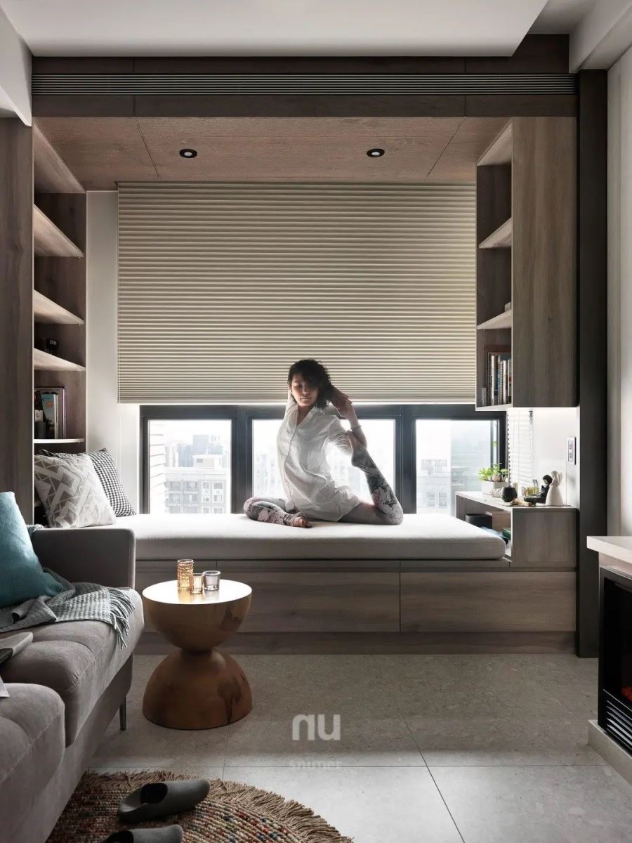 此案是置身在都会里的 53 平米单身小宅,透过回字型动线的设计,将公私领域弹性串连,客厅窗边引入充沛光源,且安排卧榻空间,彷佛一处私人天地,可进行休憩、欣赏窗外风景、阅读或是瑜珈等活动,创造日常风景。