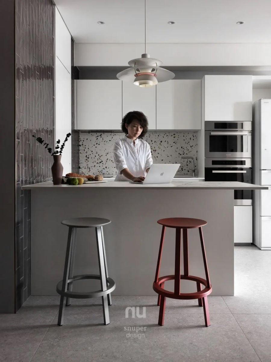 一座中岛吧台围塑出餐厨空间,在浅色木纹、砖与石材为基调下,揉合缤纷的水磨石与几何砖,妆点出活泼视感的烹饪与用餐环境。