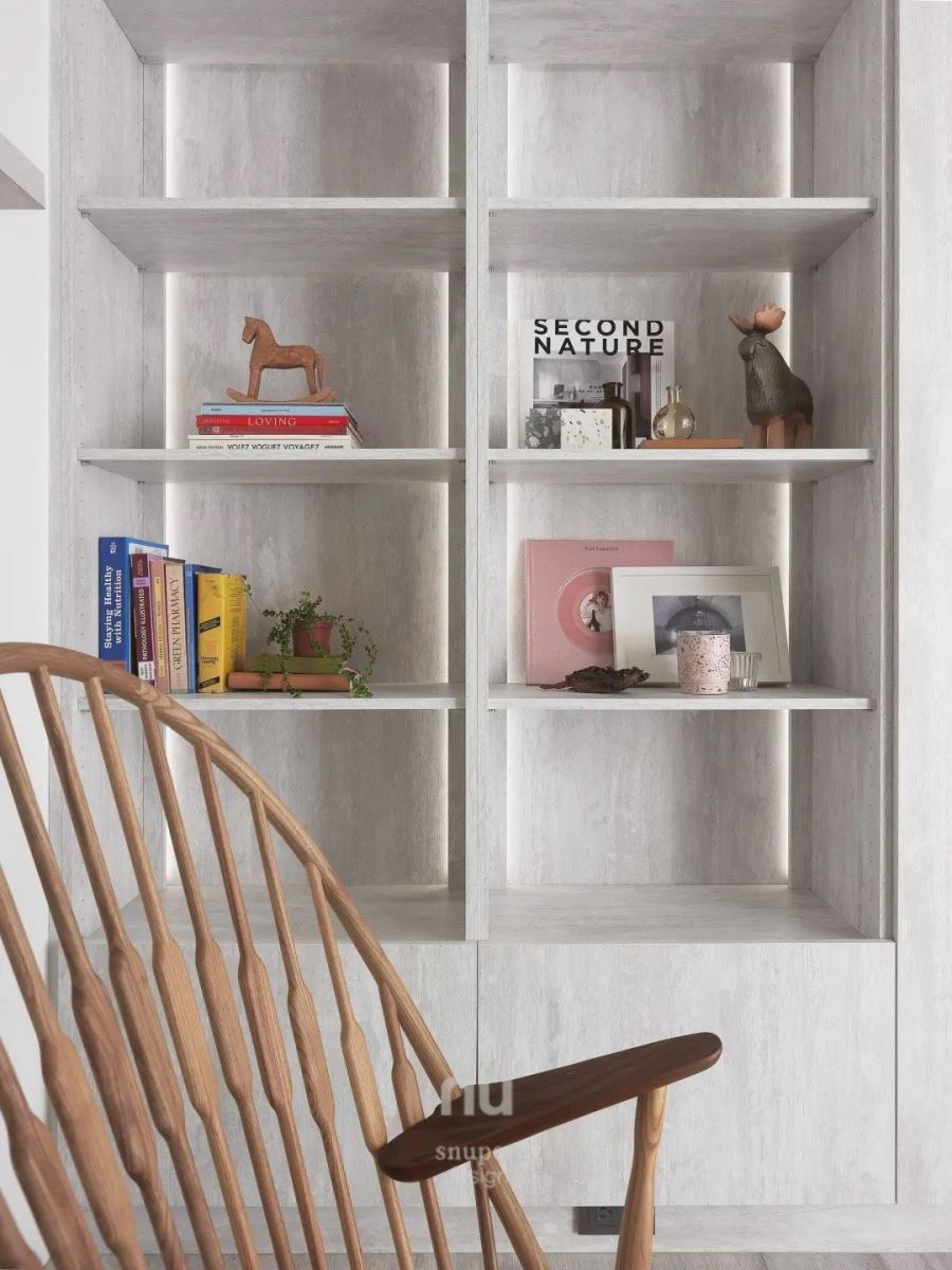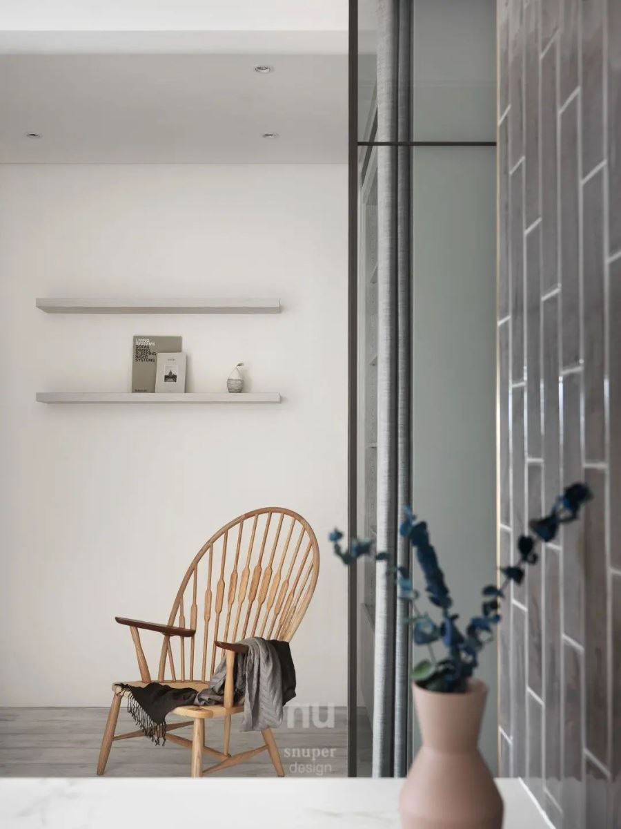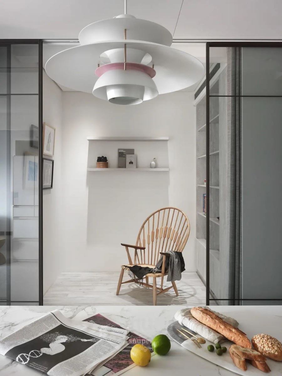 一旁藉由双开玻璃拉门创造书房区,一整面开放书柜陈列着屋主最喜爱的书籍、旅行时带回的风格对象;而两侧壁面则分别以层板营造展示美学,还有一面白墙作为艺术画作的妆点,让空间荡漾着动人的人文美学气息。