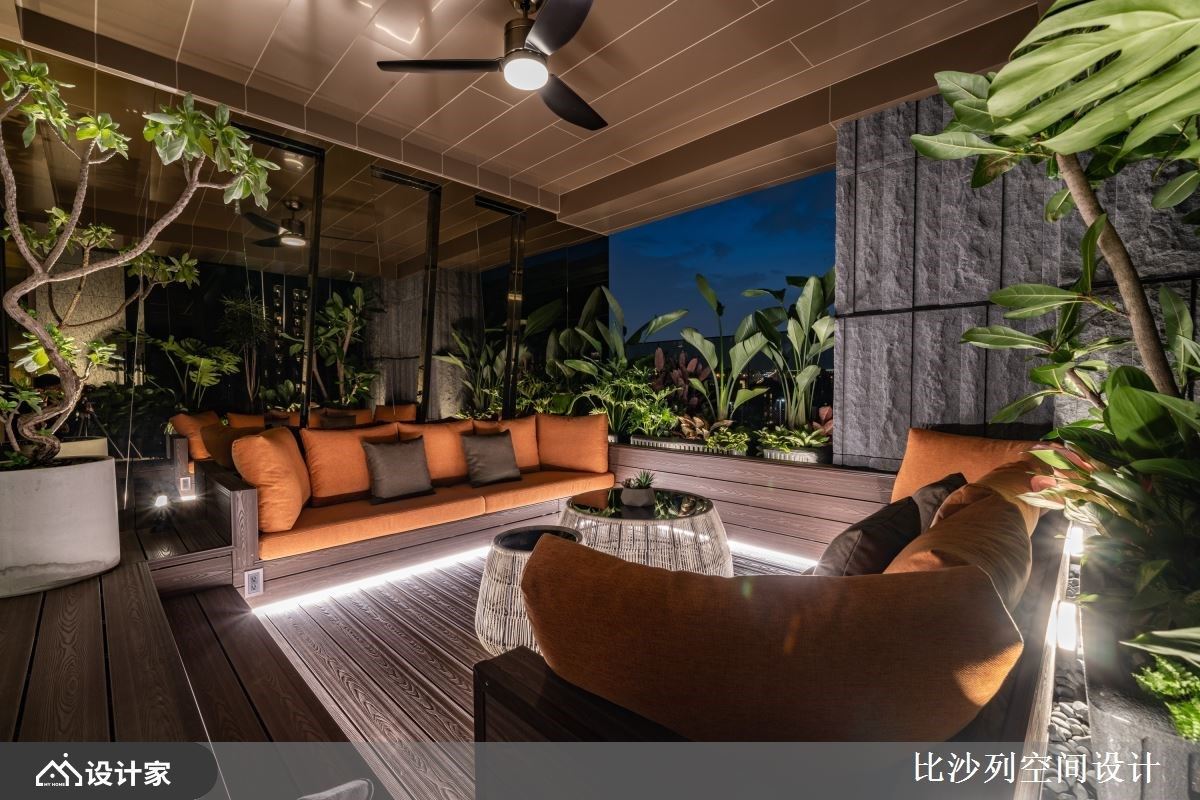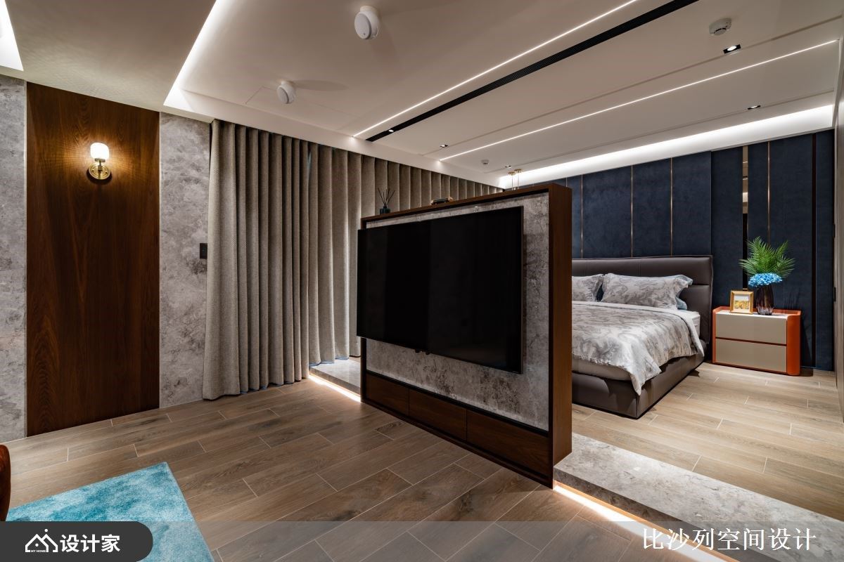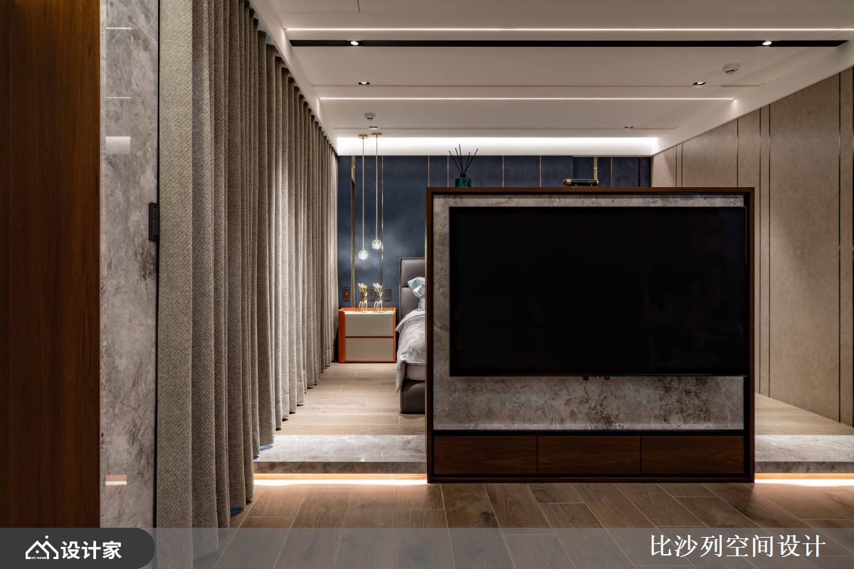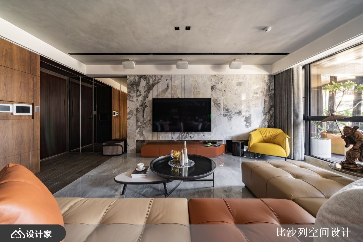 此案为234平方米毛胚屋,比沙列空间设计 张静峰总监 先是将空间机能规划为1房1厅,并缜密规划行走动线,巧妙地将舒适惬意的生活步调融入居宅期待内,同时在场域中以砖橘色的家饰软装,刻划生动鲜明的空间印象,汇聚设计焦点,塑造年轻活力的现代宅邸。 整体色彩选用温煦木质为基调,保留居住空间的暖度同时缓缓描绘沉着稳重的空间表情,于立面设计上交织一抹石纹肌理,形塑大器细腻的现代轻奢华风。 客厅的大面迎窗不仅导入充沛采光,户外庭院更于无形中串联内外视野及绿意气息,最后添设沙发休憩区,让城市景观化身午后畅谈与夜晚品酒时的天然景深。 主卧室的床头背墙铺陈灰蓝调斑驳立面,运用金属建材的搭接,凸显华美轮廓,空间中心的半高电视墙则创造回字型动线,更加入起居空间、更衣室及化妆台机能,营造舒适好眠的寝居空间。