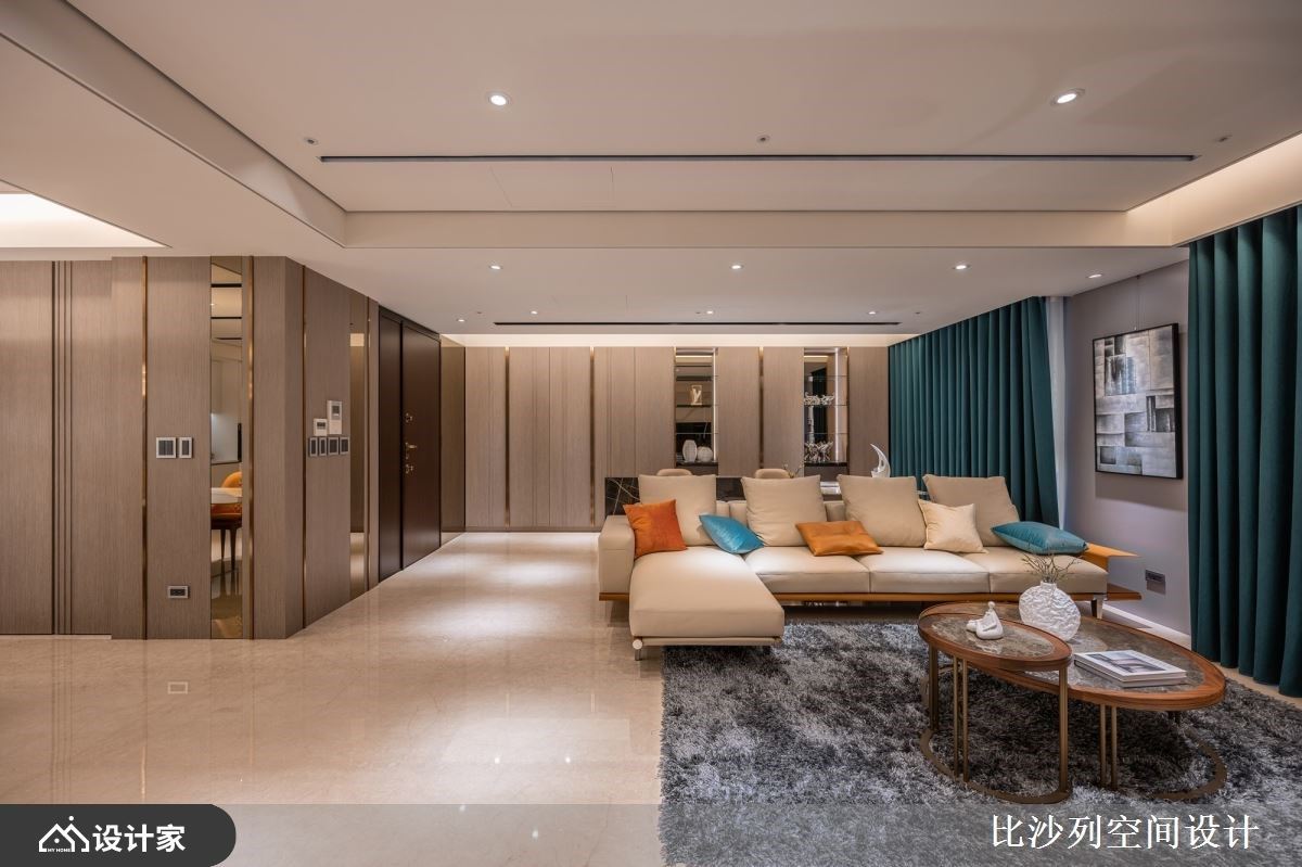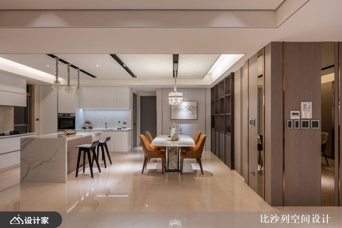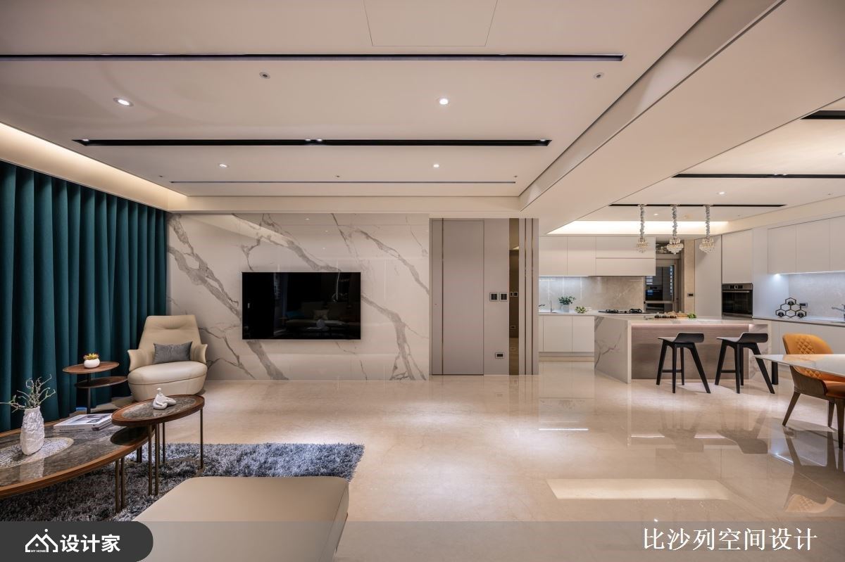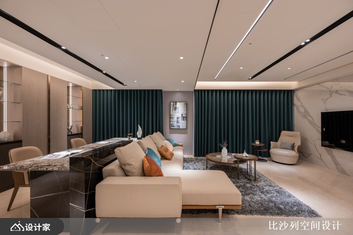 此案为165平方米现代宅,比沙列空间设计 张静峰总监,于空间色彩上选用中性灰交织暖黄杏为基底,同时在家饰软装的搭配上,以孔雀蓝为设计亮点,阐述神秘高雅的空间意象,同时于立面处增添线性造型的镀钛金属,刻划现代风简洁利落的样貌。 为了满足一家四口期待的居家空间,比沙列设计以开放式公领域作为设计主轴,舍弃既定隔间改以活动式家具明确场域分野,地坪处铺叙旧米黄大理石地坪,有效串联客、餐、厨及书房三大领域,为屋主一家争取更充裕的生活轨迹;客厅电视墙选用仿石纹大板砖铺陈,无切面的造型设计,阐述石纹肌理的天然美感;餐厨区域规划一中岛吧台,延续屋主一家烹饪时台面的使用尺度,用餐区后方的展示柜体内铺榇茶镜,让屋主的收藏化身家中的一隅端景。最后,公领域的立面设计处,镶嵌茶镜与镀钛金属,延伸空间视觉感受,同时升华场域的精致感,形塑华美细腻的现代风宅邸。