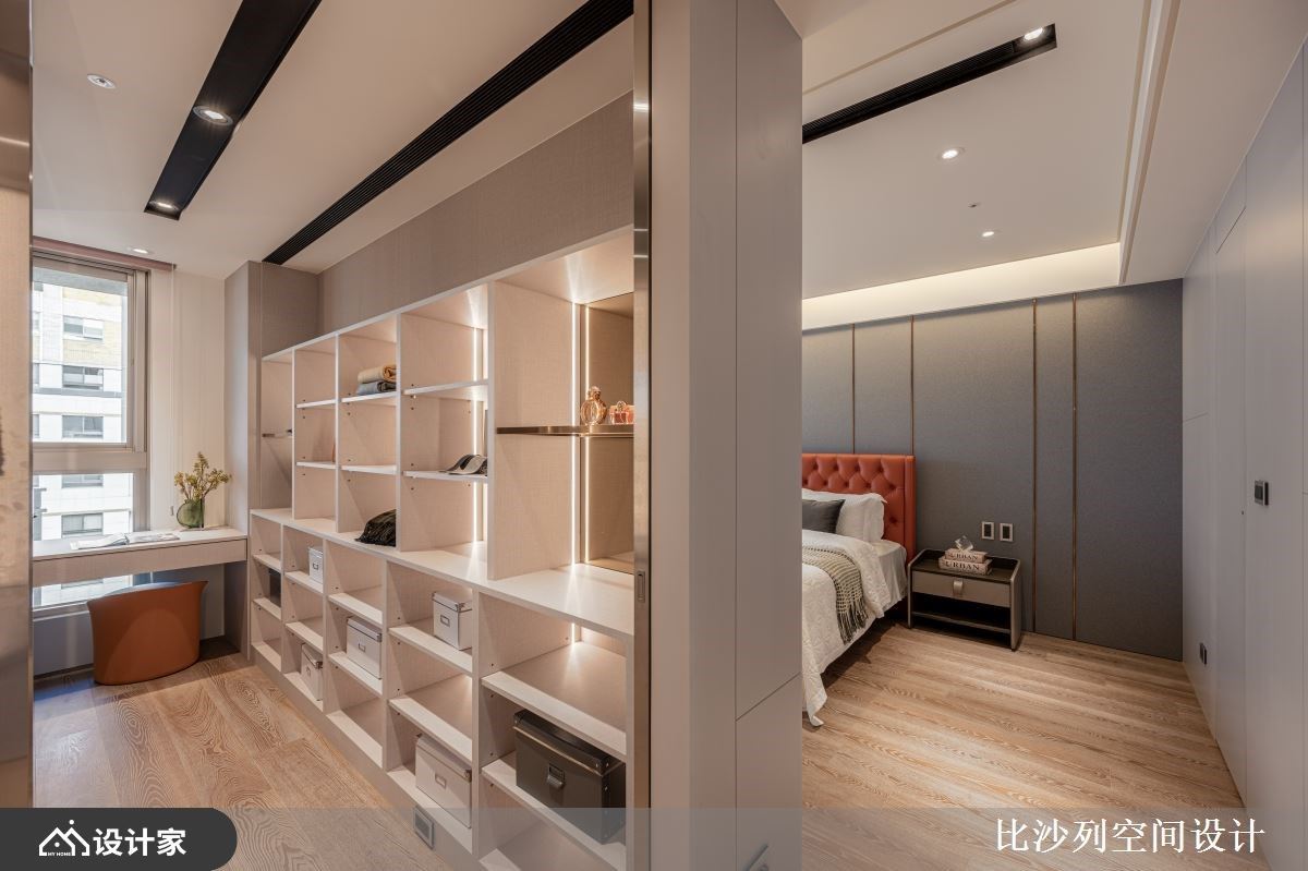 主卧房铺叙木质调地坪,烘托居宅空间的暖度,以绷布材质的床头背板,塑造静谧舒适的睡眠空间,同时加入充足收纳的更衣间,以机能完善夫妻俩期待的私领域。