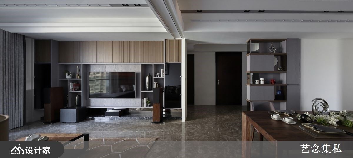 玄关虽然在坪数中占比不高,但所需要的考量的点可是要特别细腻!艺念集私空间设计张绍华、黄千祝总监善于将收纳结合屏风设计,让进门后可以有便利的平台放置随身物品,也能穿插布置居家装饰;而收纳柜体的组成以轻隔间方式思考,既可以化解穿堂煞的风水疑虑,也可以轻松界定机能区域,带给室内充足的隐私。进入公领域后客厅坪数通常占比最大,而一大部分的居家收纳也要仰赖客厅区域,尤其是电视墙面的设计,以系统柜打造复合式柜墙,预留电视壁挂的空间,两侧可以依照要收纳的物品规划层板、格柜或电视机柜,完美整合需求后创造风格与实用性兼具的收纳系统。