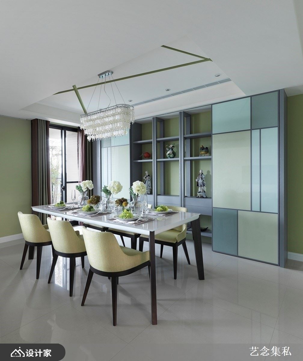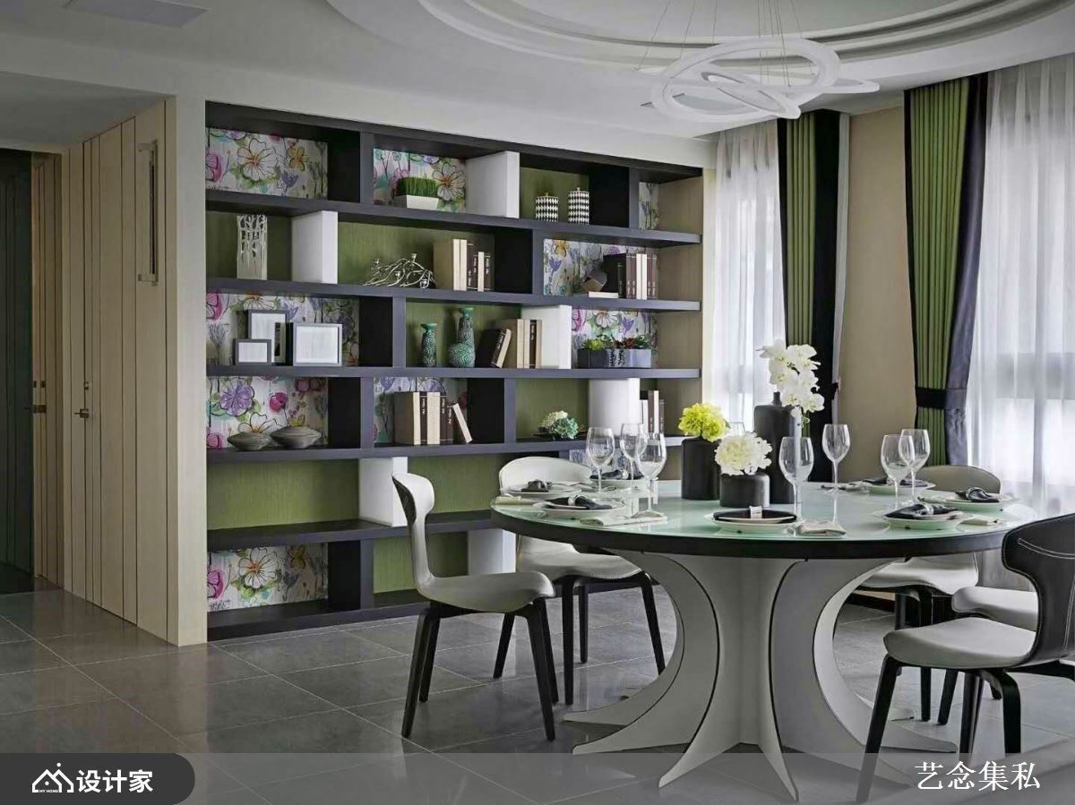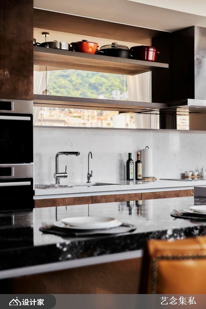 现代人多为客餐厅联通的开放式设计,不仅在动线上更顺畅,连带的可以规划收纳的形式也更为多元,艺念集私空间设计张绍华、黄千祝总监在规划餐厅空间时着重在用餐的氛围,除了餐灯、餐椅等家具调性要一致,还时常将邻近的墙面打造成展示收纳墙,运用层板或格柜创造灵活的置物空间;透过特色壁纸、绷布、镜面和灯带等创造出别具机能的餐厅布景。而厨房转变更是从传统系统橱柜设计延伸出变化,不仅在板材和颜色上更多元,也会客制化层板、吊挂以及玻璃柜摆放特定的厨具或餐具,让厨房不在只是一个机能区域,而是带有生活美学的机能空间。
