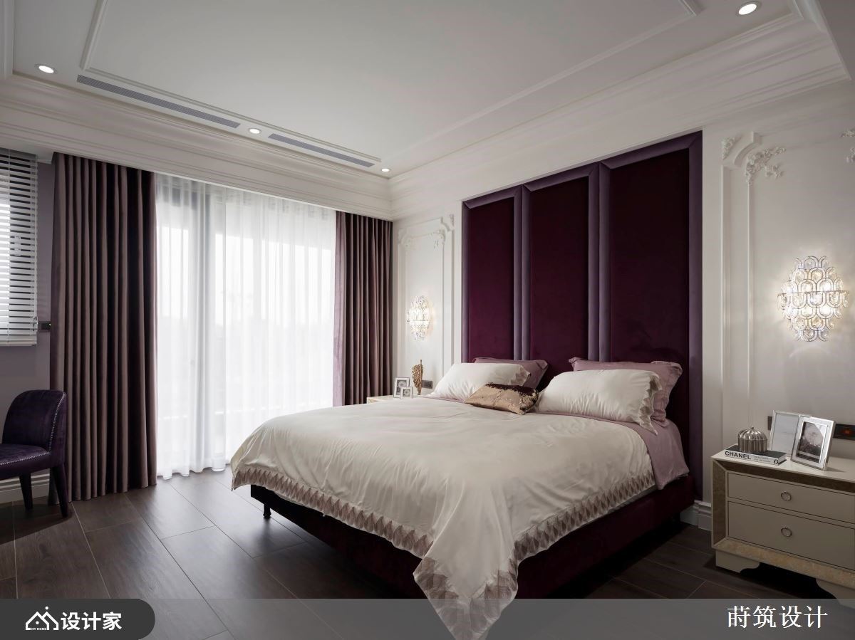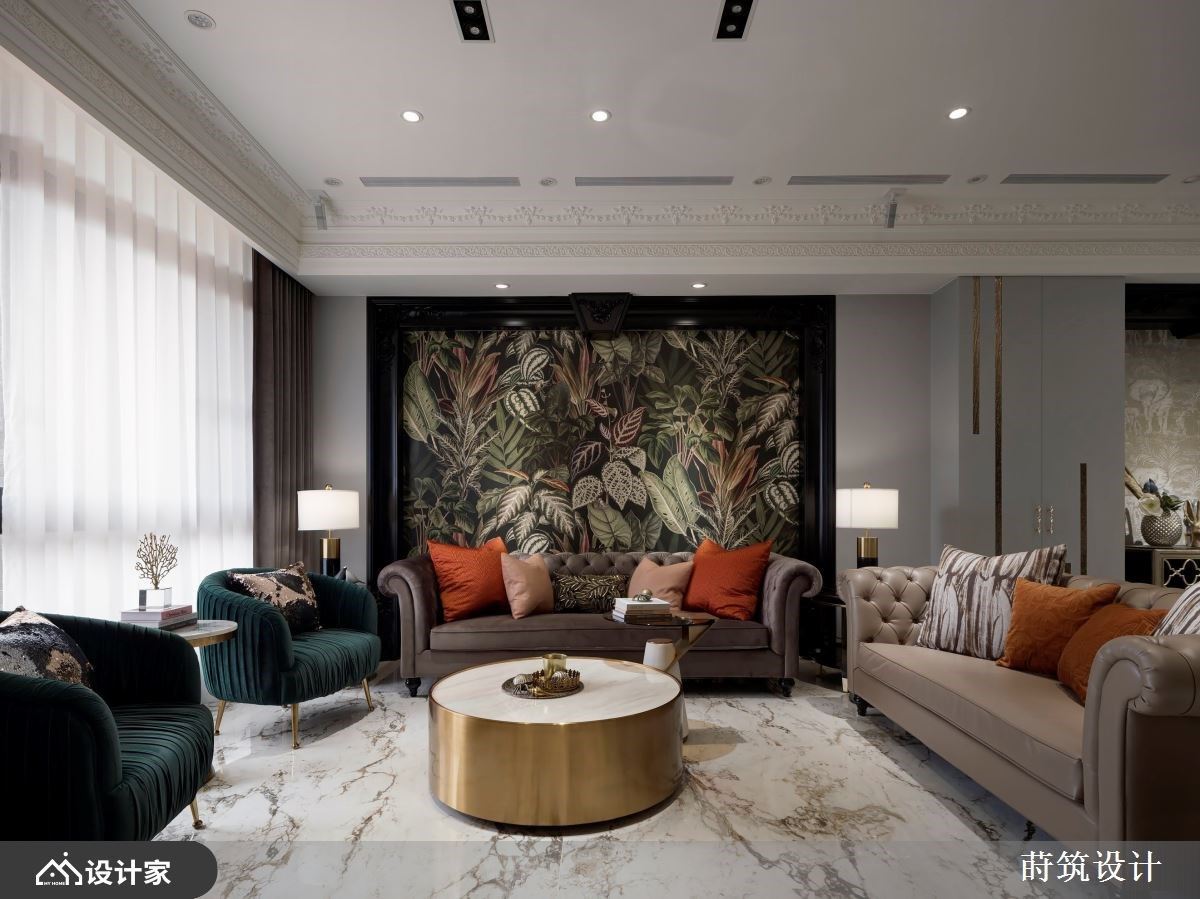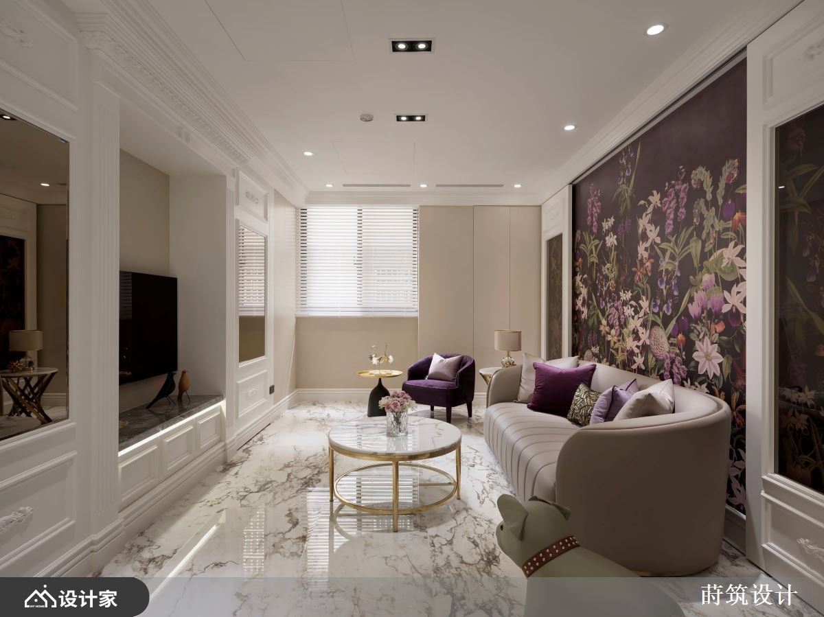 此案是自地自建设计,以新古典风格打造整体空间,除了古典细节的安排,更透过边框、图腾墙纸与自然语汇,华丽之中赋予生命力的美学灵感。 一道黑色边框成为玄关与公领域的分野,同样的元素也运用在餐厅与轻食区之间,巧妙呼应新古典语汇,拉出领域层次。整体空间的天花板利用雕花滚边,彰显古典工艺的丰采;而进入空间后,深深被热带雨林视觉的背墙所撼动,深色边框里铺陈丛林风的进口墙纸,有如画作框景的艺术力道。水晶质感的石材电视墙,结合阶梯设计与灯带安排,在古典的语汇里,倾注纯净高雅的现代质感。 餐厅里,餐柜中间镶嵌茶瀑镜,以直瀑式妆点柜体,一旁壁面安排大象图腾墙纸,与沙发背墙共同对应原始丛林之美;天花板垂挂水晶吊灯,以皮革包覆圆形金属框,结合烟熏色与透明色水晶,即使关灯后,也能欣赏到水晶吊灯独特之美。 小编的最爱 女主卧床头利用深浅紫色打创造边框视觉,展现优雅与浪漫。男主卧的床头结合图腾,壁面利用古典线板勾勒层次,并透过木纹柜体安排,彰显英伦贵族风。儿子房的入口处以绿色特殊墙纸,纳入LED光圈的设计,诠释时尚感的雅痞味。