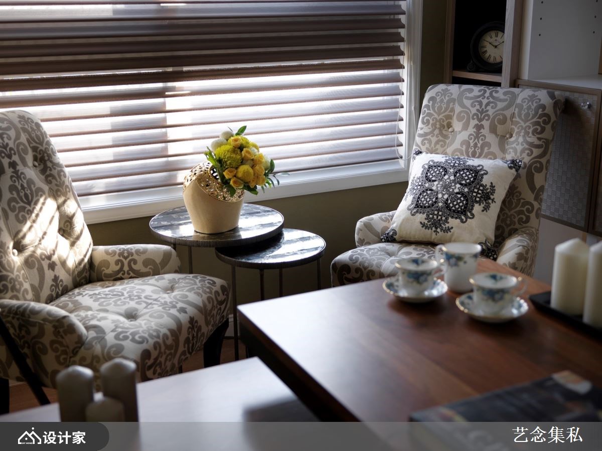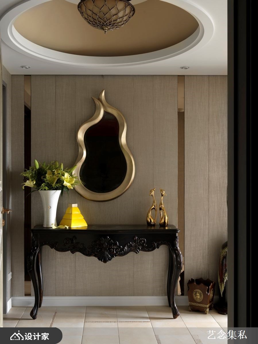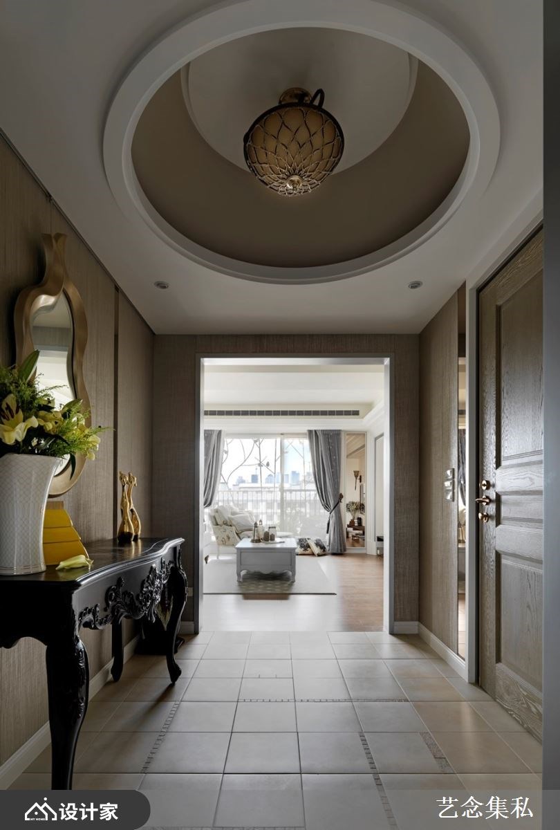 改造指南 1. 别致玄关端景设计 2. 格状书柜创造理想隔屏 3. 床头设计诠释经典美式风 设计师这样做 推开大门,温润米色磁砖铺陈地面,壁布镶嵌金属饰条衬托着猫脚玄关桌与造型化妆镜,呈现优雅别致的玄关端景。天花板特别深的圆弧设计,清楚界定落尘区、让回家充满浓浓的仪式感。 依循长型空间,将客厅、餐厅与书房安排在同一轴线上,客厅与餐厅以沙发区隔,餐厅与书房特别订制大型展示书柜提升书房隐私性,上半部格柜透过书本和家饰摆设达到视觉局部遮蔽,但光线与空间感依然通透,屏风与收纳机能完美整合,还能双面使用。两间卧房设计上都运用了美式风经典的高床头板与线板设计,主卧床头柜勾勒线板装饰,两侧对称粉色床头营造柔美的气息。客房风格墙纸搭配白色高床头板,深浅棕色搭配蓝色床包,营造一室亲切优雅。 小编的最爱 182 平米新成屋以美式软件做大量铺排,隔间强调视线感与光线的流动,运用隔间当作收纳墙,书房旁窗边椅凳搭配百叶窗柔光洒落形塑舒适的休憩区,实践夫妻日常的浪漫。