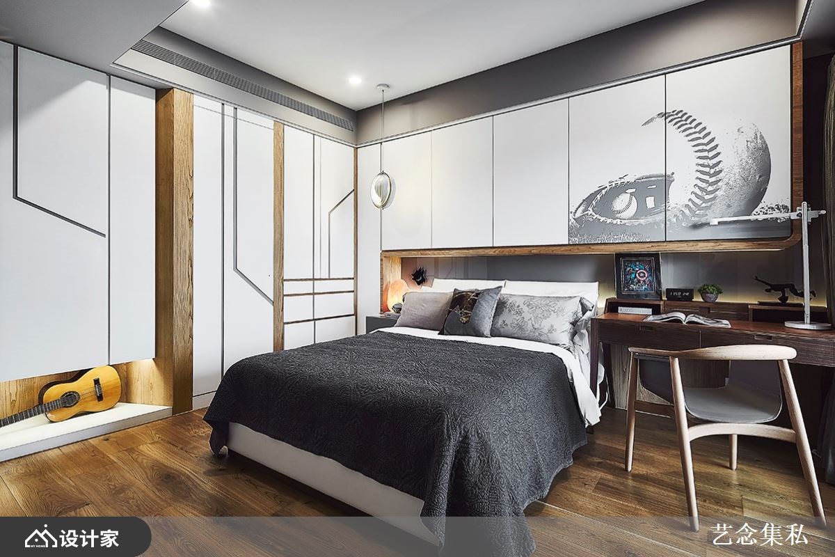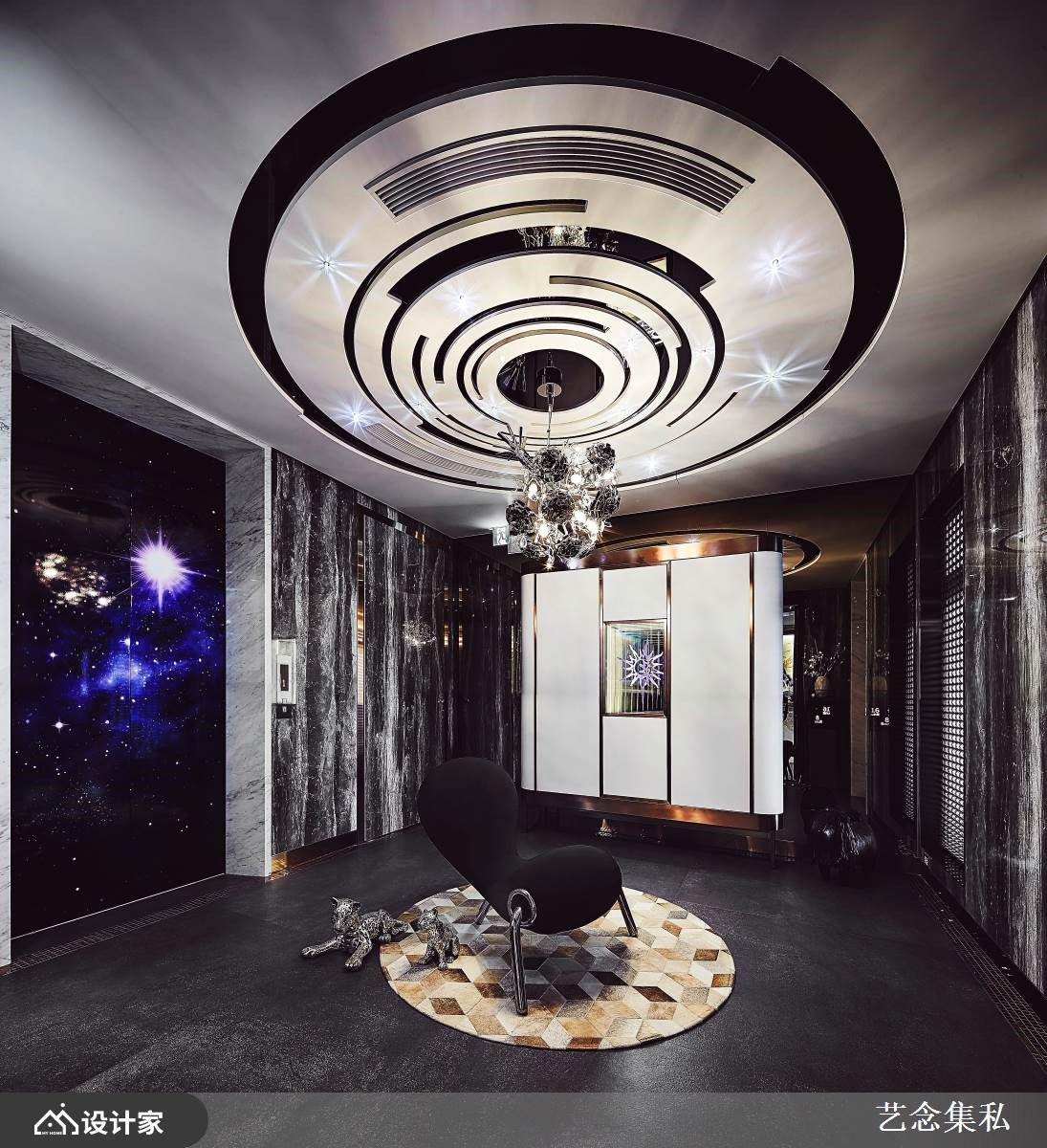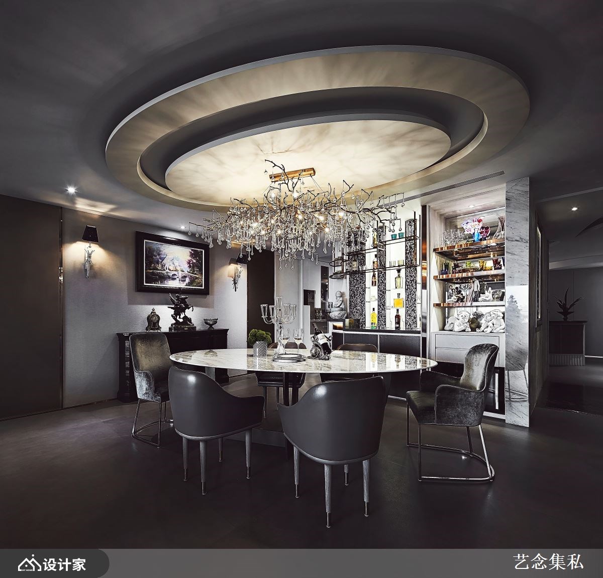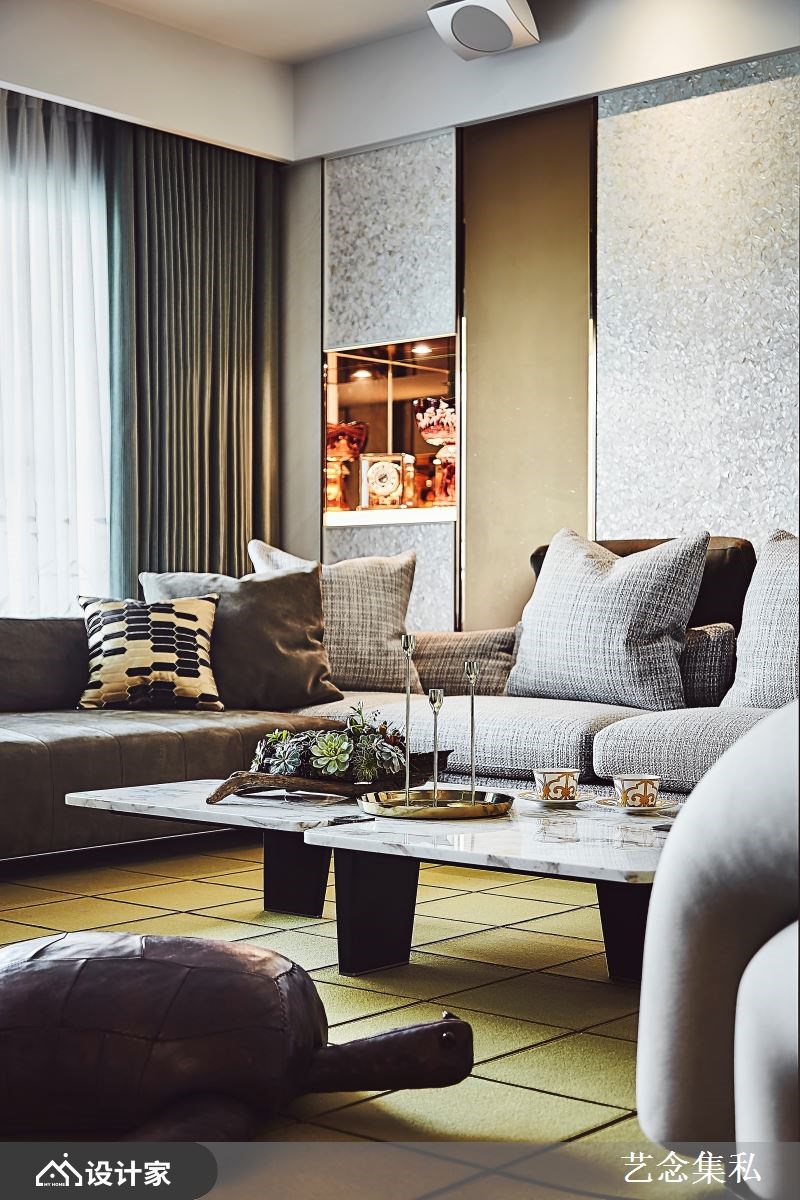 改造指南 1. 迎宾玄关与窗景大客厅 2. 精品宴客餐厅与藏酒柜 3. 复合建材营造写意寝室 设计师这样做 第四度委托艺念集私打造 528 平米住宅,以全客制化概念规划五房三厅,搭配特殊材质与设计家具,打造出带有屋主识别的豪邸。有别于一般豪宅梯厅,设计师以宇宙间日月星辰的环形为灵感,镂空雕刻造型天花板,搭配钛金属与嵌灯,象征延续家族情感的希冀。 长型客厅引入采光与窗景绿意,电视墙使用木皮、琥珀镜、贝壳饰板、晶体纹裂石材与镀钛金属异材质混搭,诠释俐落精致的主墙设计。餐厅虽仅临客厅,但天花板的同心圆设计界定了场域,星辰轨迹雕刻与葡萄牙精品水晶玻璃吊灯,宛如垂降的艺术品,搭配大理石椭圆长桌营造出星级宴客空间。备餐柜规划酒饮调制区与展示架,大方展现屋主的收藏品味;酒柜后方规划琴房,搭配瓷器展示增添人文艺术风范。 小编的最爱 床头龙凤石如绵延远山,搭配更衣室的皮革刺绣白梅鸟嬉,将惬意的山水景致带入睡眠场域。两间男孩房分别选择宝蓝和浅灰色调,添加孩子喜欢的棒球图腾、窗边飘窗设计,赋予空间更多生意。