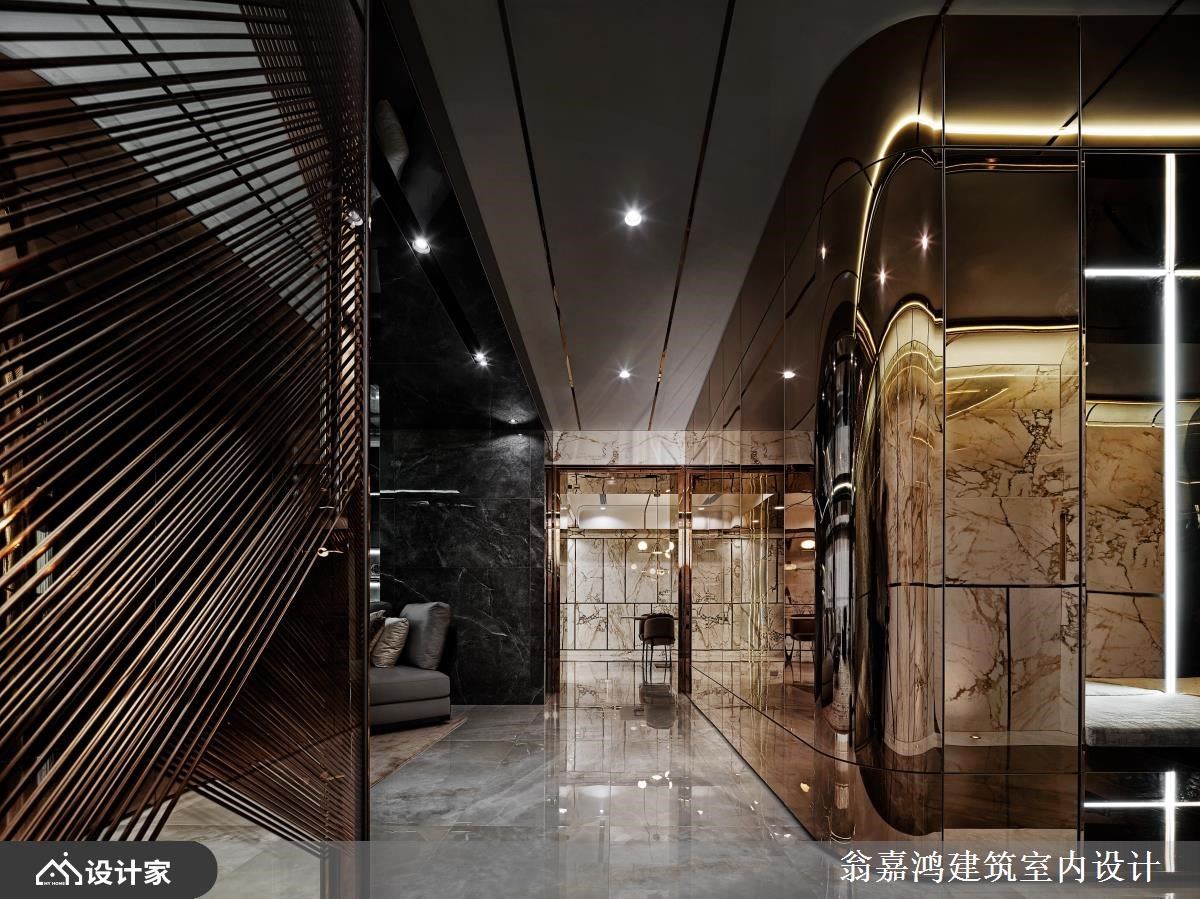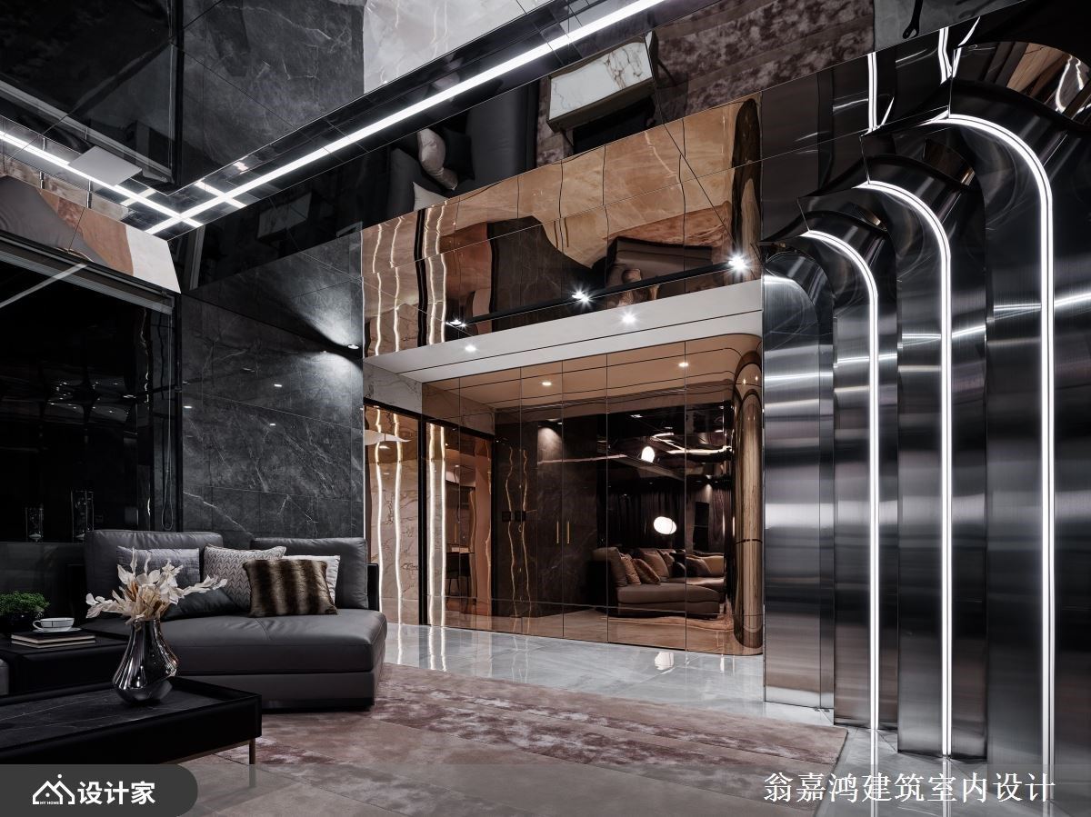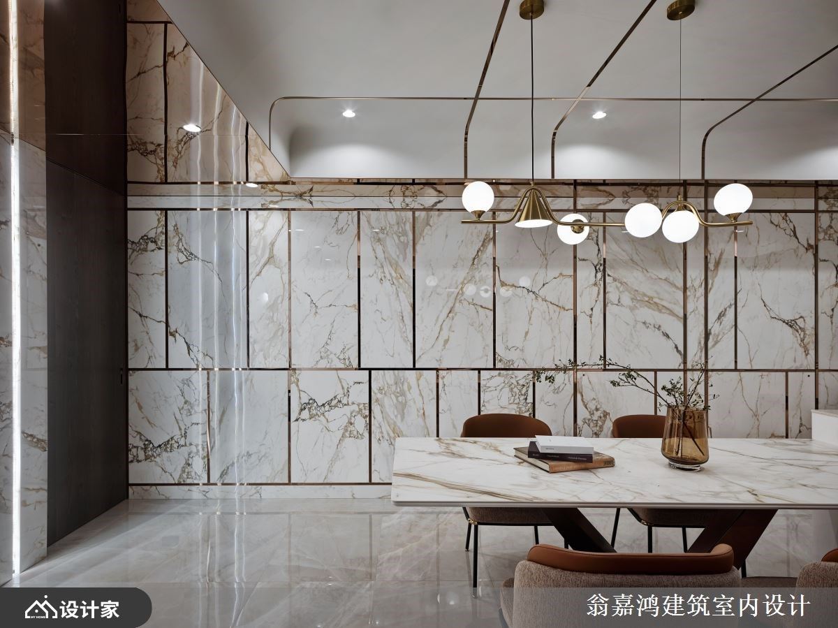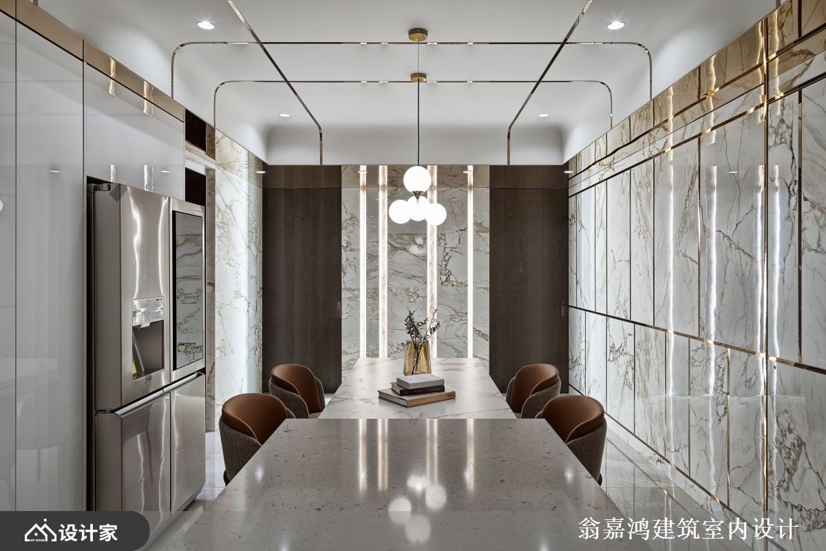 297平米毛胚爆改混搭风空间,设计师利用镀钛、磁砖与铁件,诠释轩昂大器的空间气势,也成就一家四口美好生活。 墙面利用茶镜搭配灯带,延伸玄关尺度并创造温暖气息,柜体包覆镀钛金属的 手法,创造奢华端景视觉。深灰砖面铺陈电视墙,渐层框景视觉提升客厅气度;天花板利用最高点,避开梁下最低点的巧思,铺陈大面镜子材质,并安排铝板,连电视墙侧面的过道也如此活用,形塑挑高视觉尺度。 背墙让玻璃隔出书房区,书房内的展示柜辅以照明,增添人文美学风采。来到餐厅空间,藉由白色调为基底,融入大板砖拼接墙面风貌,结合镀钛切割空间感,展现奢华唯美的飨食氛围。 小编的最爱 渐层米色砖铺陈床头墙造型,利用渐层几何堆栈立面,镀钛线条勾勒墙面柜体质感,挹注奢华时尚的意象。