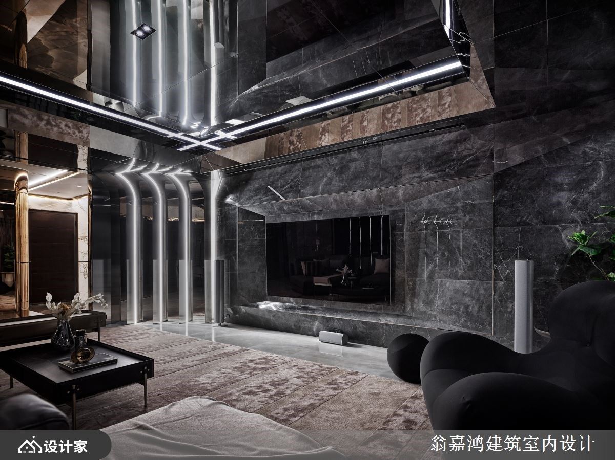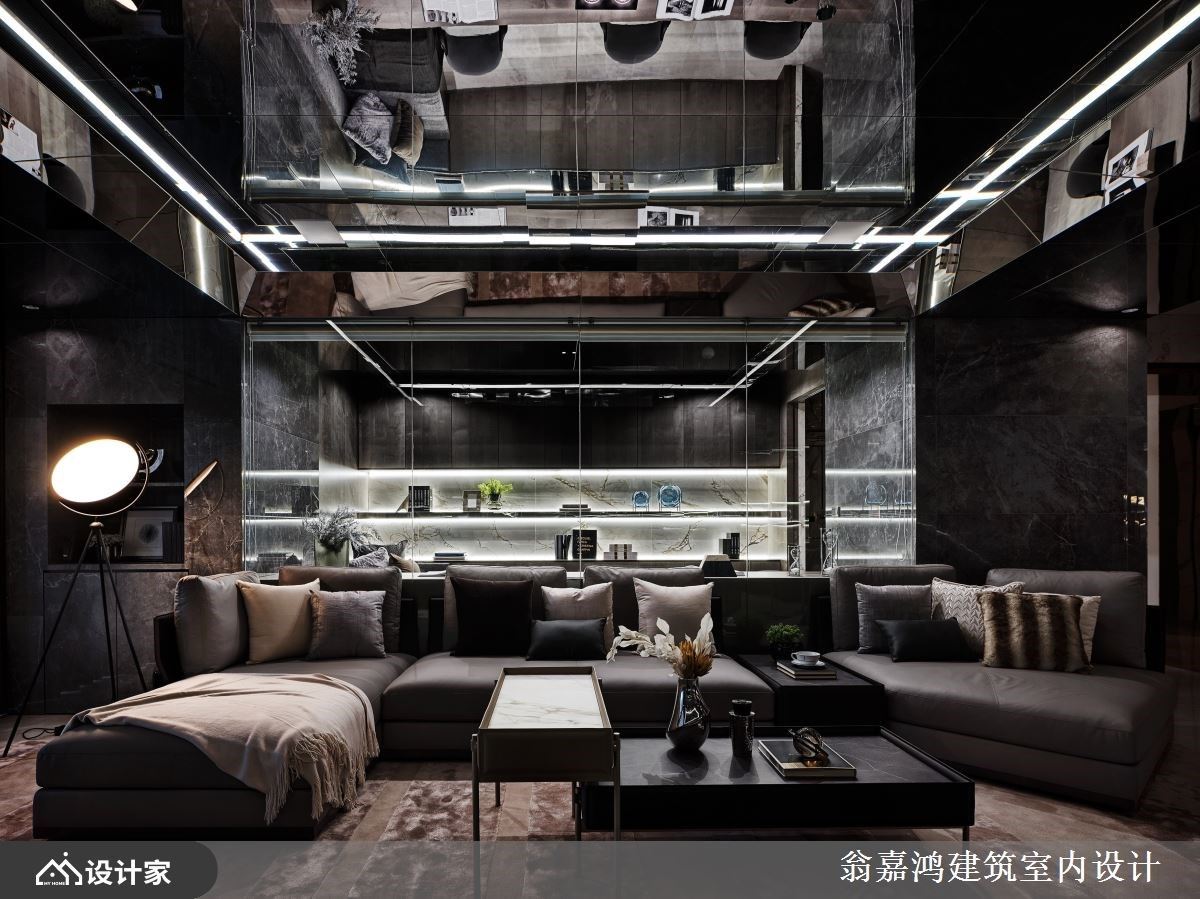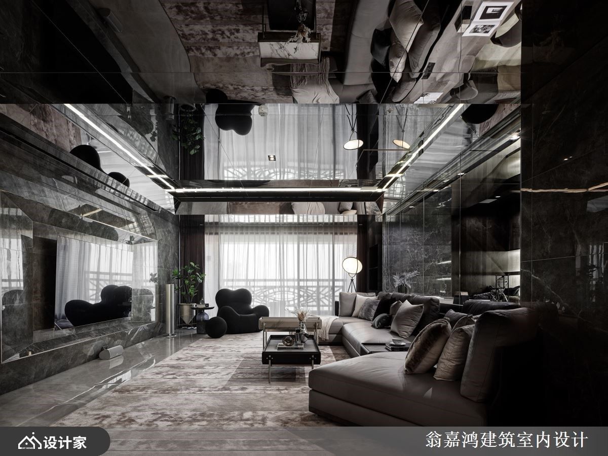 297平米毛胚爆改混搭风空间,设计师利用镀钛、磁砖与铁件,诠释轩昂大器的空间气势,也成就一家四口美好生活。 墙面利用茶镜搭配灯带,延伸玄关尺度并创造温暖气息,柜体包覆镀钛金属的 手法,创造奢华端景视觉。深灰砖面铺陈电视墙,渐层框景视觉提升客厅气度;天花板利用最高点,避开梁下最低点的巧思,铺陈大面镜子材质,并安排铝板,连电视墙侧面的过道也如此活用,形塑挑高视觉尺度。 背墙让玻璃隔出书房区,书房内的展示柜辅以照明,增添人文美学风采。来到餐厅空间,藉由白色调为基底,融入大板砖拼接墙面风貌,结合镀钛切割空间感,展现奢华唯美的飨食氛围。 小编的最爱 渐层米色砖铺陈床头墙造型,利用渐层几何堆栈立面,镀钛线条勾勒墙面柜体质感,挹注奢华时尚的意象。