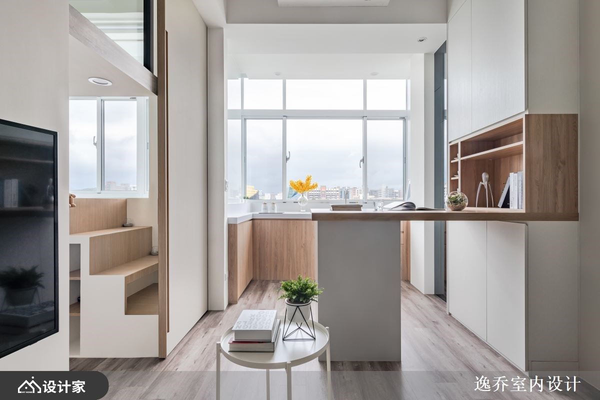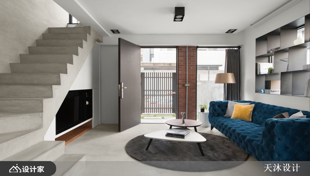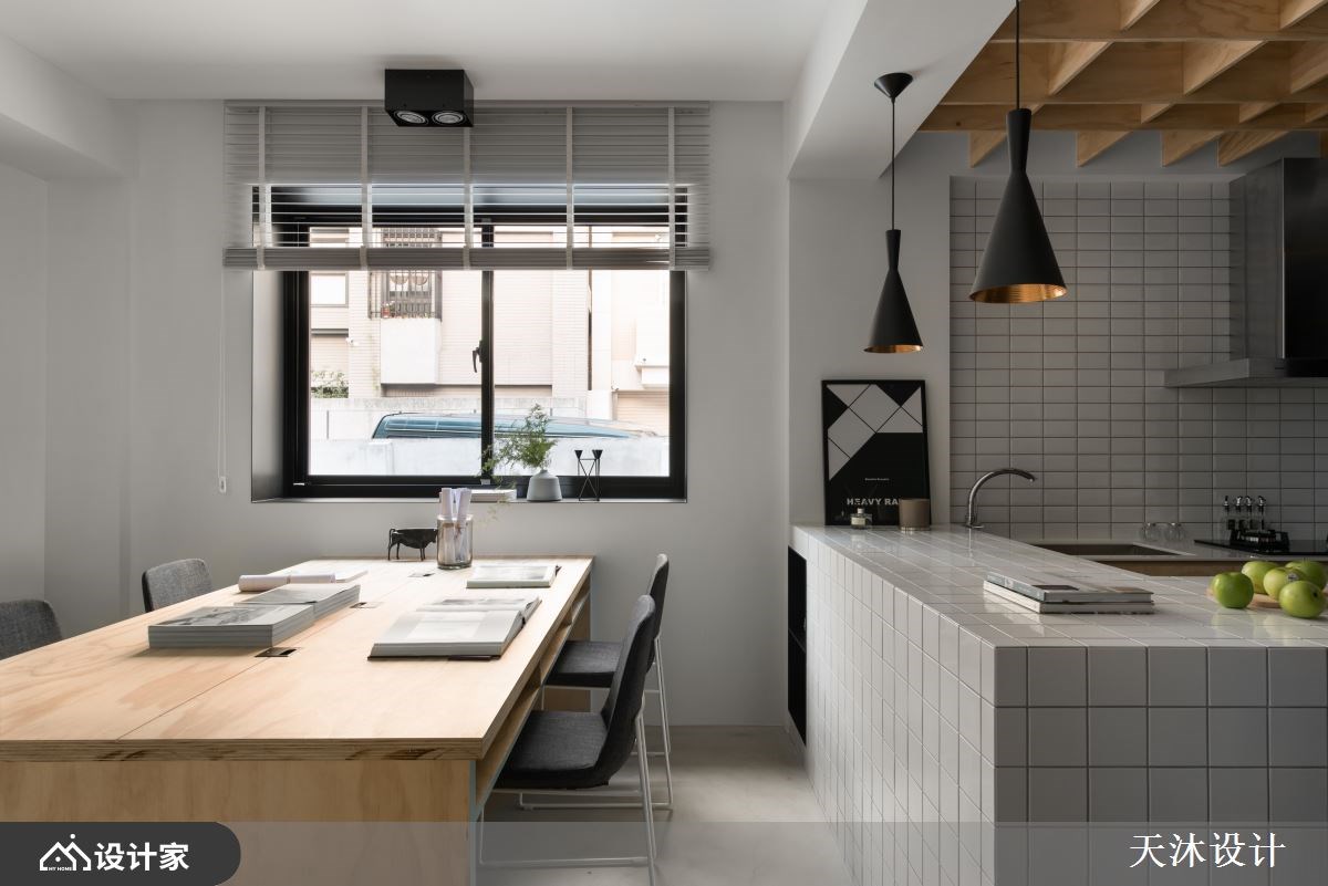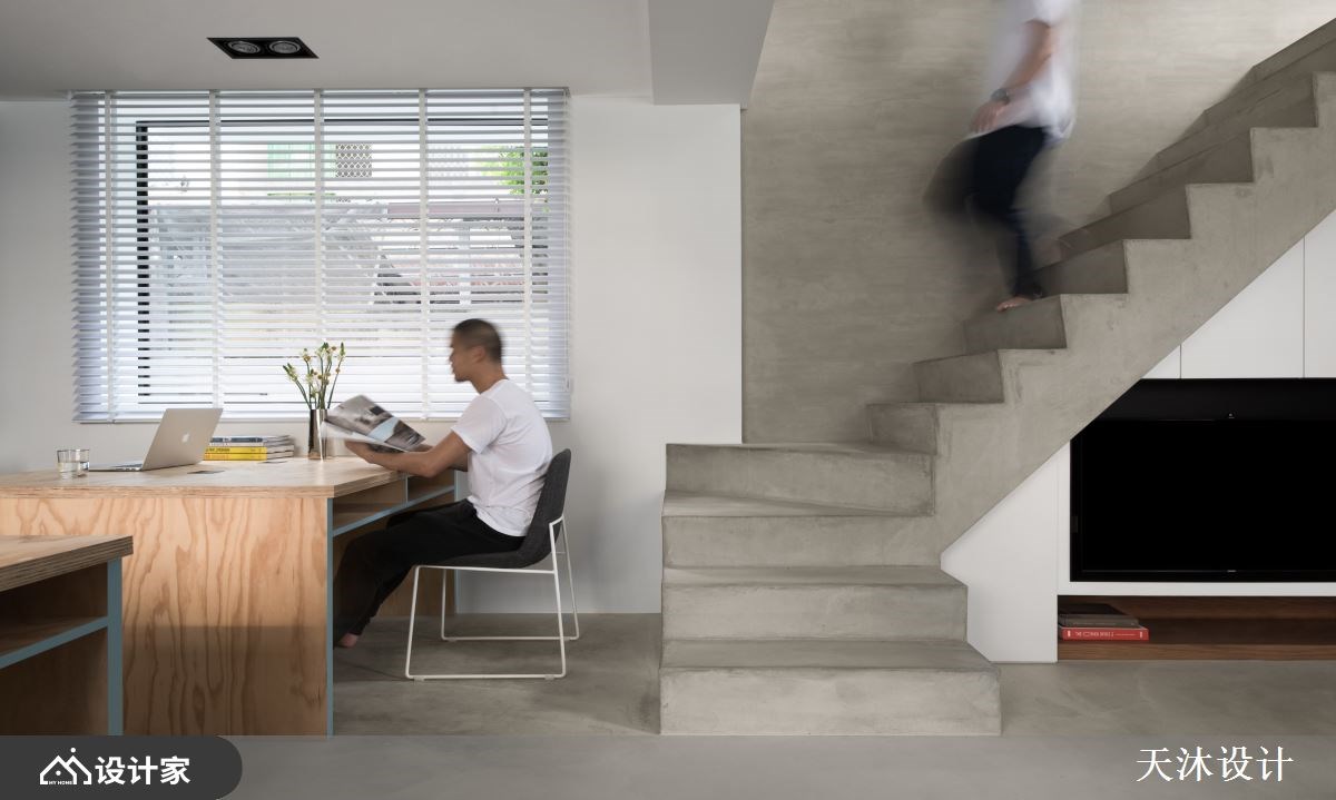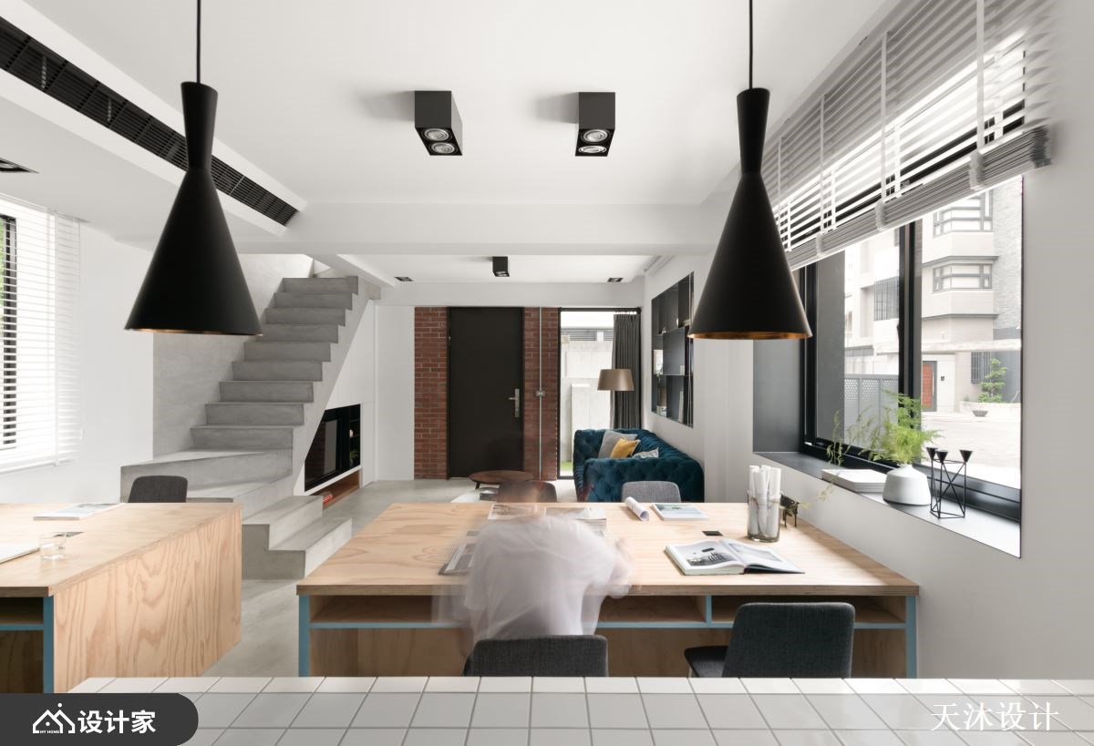 改造指南 1. 除去隔间墙的束缚 2. 简约设计突显老宅魅力 3. 引入窗景增添住宅生命力 设计师这样做 182 平米别墅欲满足居家工作室机能复合的需求,利用独栋优势分层规划公私区域;平面规划上先除去传统老屋过多的隔间,混凝土无扶手阶梯衬托空间宽敞感;透过沙发、办公桌与厨房中岛界定出各个机能区域,不仅空间感大增,动线与采光也一并被优化了。 改造过程中除了保留老宅红砖与屋顶瓦片,并以白色油漆和清水模涂料等简约材质打底;家具使用不收边松木合版,仅以水性漆处理保留建材的质朴样貌,呼应老宅的历史韵味;厨房天花板上格子格栅与柜体对比、和木桌呼应。二楼的私领域以人字纹木地板搭配清水模涂料墙面,透过土耳其蓝的跳色书桌诠释以传统孕育出的新样貌。居室大面采光窗采取纱帘与布帘,柔和睡眠区域,而阅读区的窗扇则以卷帘设计,方便调节也省空间。 小编的最爱 独栋透天改造计划中,灵活运用了建筑的每一面窗扇。客厅沙发背后的大窗以铁件打造成开放书架,集机能、采光与端景为一体。办公区旁的窗扇用白百叶来调节光线;窗台宽度可以用来摆放植栽与香氛,营造舒服的工作气氛。