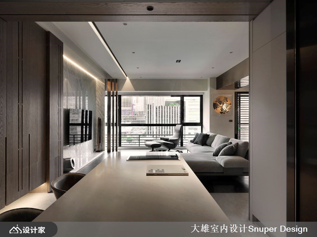 位于金融重镇132平米的现代风住宅,居住者为1位单身男性,希望在空间规画上达到因地制宜的目的,创造出台北纽约印象,维持与城市疏远又紧密的关系,既保有人际互动交流,却又不失个人隐私性。 在格局规划上,让客、餐厅两扇窗户串联,建筑物外有着熠熠光彩的城市之景,通过玻璃窗,城市起伏的天际线,让人感受到的是都会的、自由的、尊享的生活方式,在保持人际互动交流,却又不失个人隐私性的状态实现美好生活的实践。 中岛是让居所更具温暖互动的媒介,安排于进门处,内含各种厨房家电设备,可支持轻食、火锅、小酌等各种情境,此处,更将户外风景尽收眼底,成为家中最无价之艺术。延续大雄擅长的材质操作,地坪则采用地砖与木地板拼接,区隔出生活场域和行走动线,电视墙使用浅色大理石贴覆,并通过倒斜角的工艺技术增加细节的精致度。大梁以镀钛金属包覆,保留大墙大柱的建筑美学,虚化横亘空间中心的突兀感,而镀钛金属元素更用于许多细节的修饰,彰显了经典与现代主义,实现一种精致的高级感。
