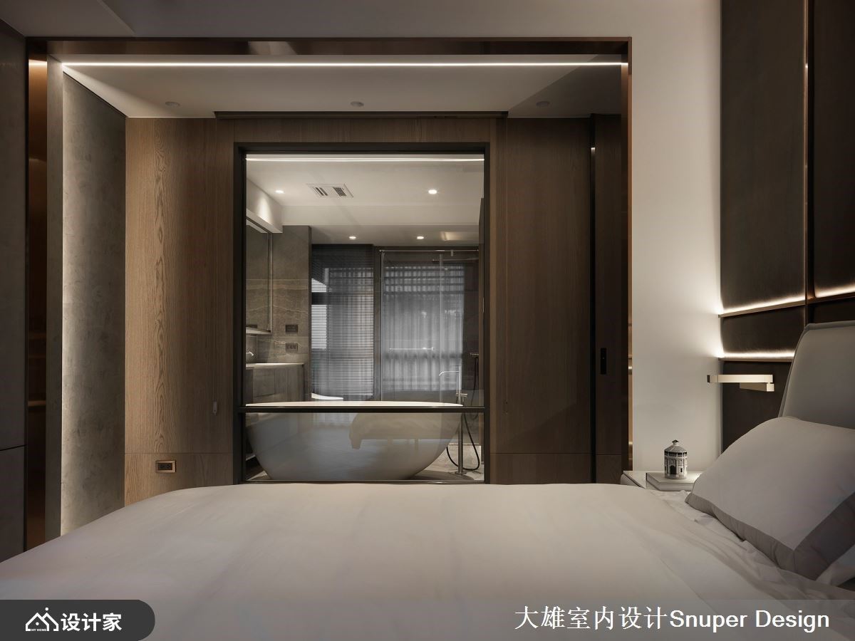 对生活而言,「家景」亦是风景,通过镀钛金属制作而成的「框」,裱框主卧一侧衛生間之景况,实现步移景异的层次,同时也让光线流通。主卧床头墙以绷皮结合镀钛光带,地坪采人字拼,与行走动线有所区隔,再再显现低奢质感。