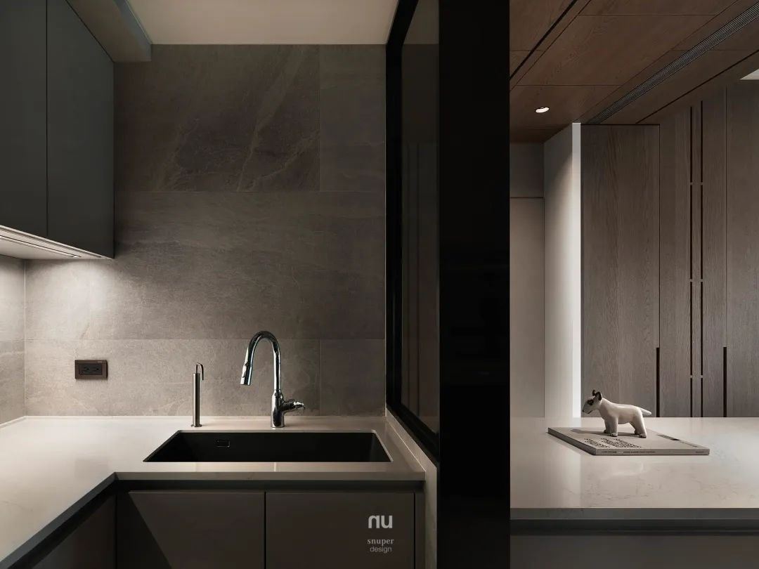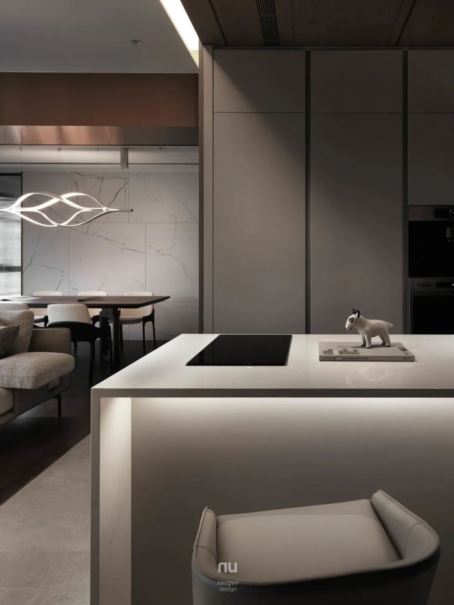 中岛深为让居所更具温暖互动的媒介,安排于进门处,内含各种厨房家电设备,可支持轻食、火锅、小酌等各种情境,中岛的存在强化了空间的张力,而敞朗的开放空间不仅分享到明亮采光,至此,更将户外风景尽收眼底,成为家中最无价之艺术。
