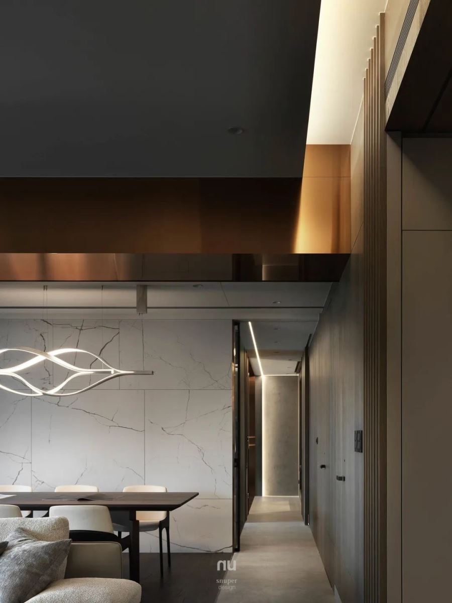 大梁以镀钛金属包覆,保留大墙大柱的建筑美学,虚化横亘空间中心的突兀感,而镀钛金属元素更用于许多细节的修饰,彰显了经典与现代主义,实现一种精致的高级感。