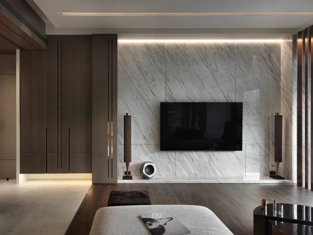 延续大雄擅长的材质操作,地坪则采用地砖与木地板拼接,区隔出生活场域和行走动线,电视墙使用浅色大理石贴覆,并通过倒斜角的工艺技术增加细节的精致度。