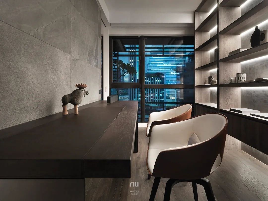 内缩后的书房区域,保有良好采光,以石纹砖做为主墙面,结合开放式书柜打上间接光源强化空间个性,内敛沉稳、融合人文底蕴。